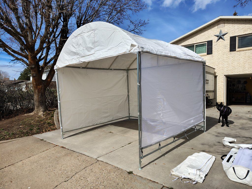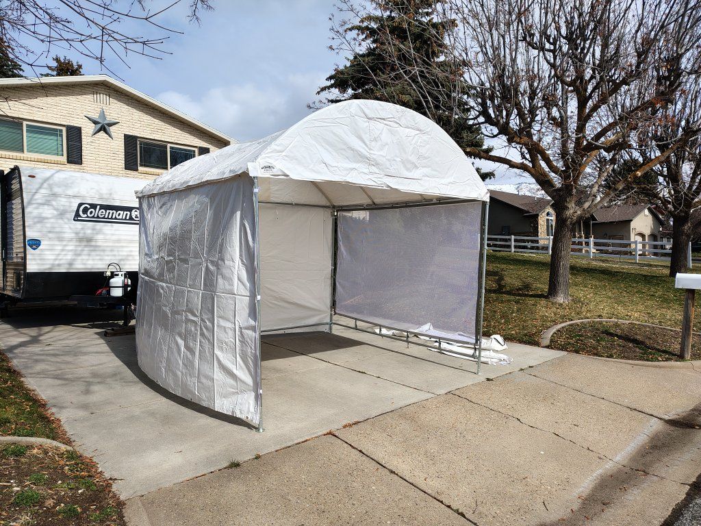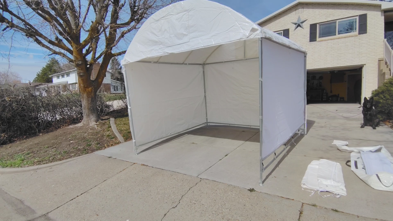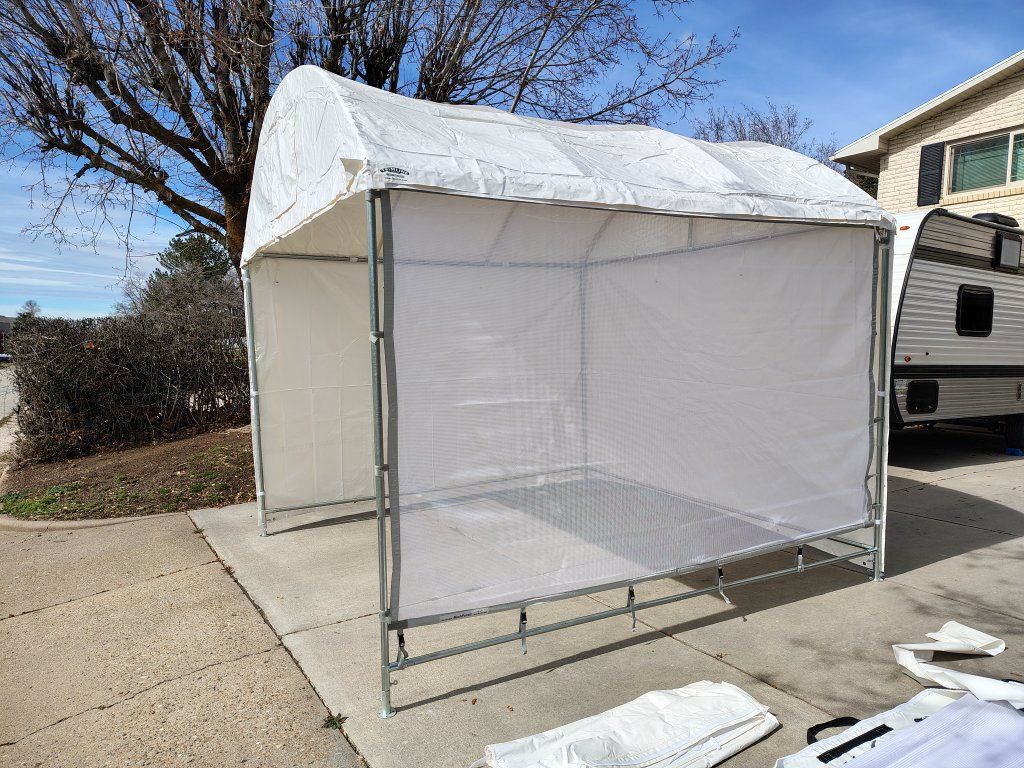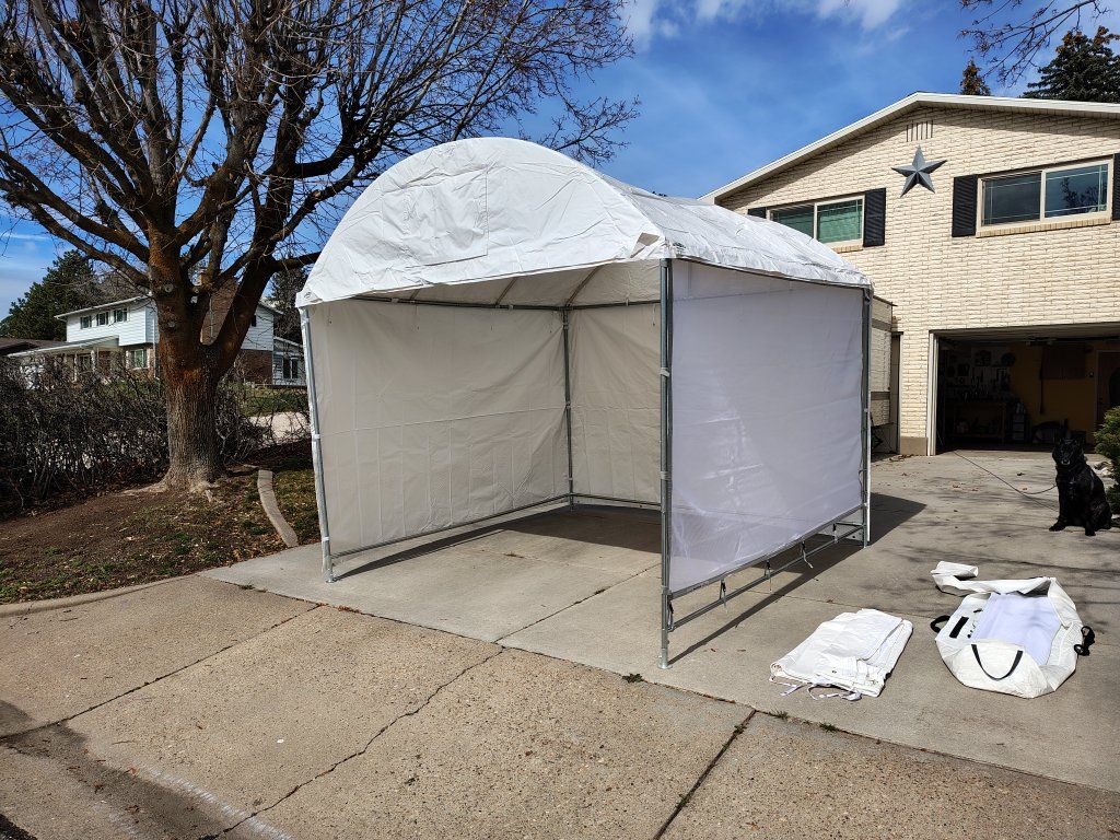 This Trimline 10x10 Canopy is made by Flourish. It was probably used 4 or 5 times and is like new! Included are all 4 walls and three mesh panel display walls for hanging artwork. The mesh panels can be hung with or without the walls depending on the weather. There are also 4 sandbags included that aren't shown in the photos.