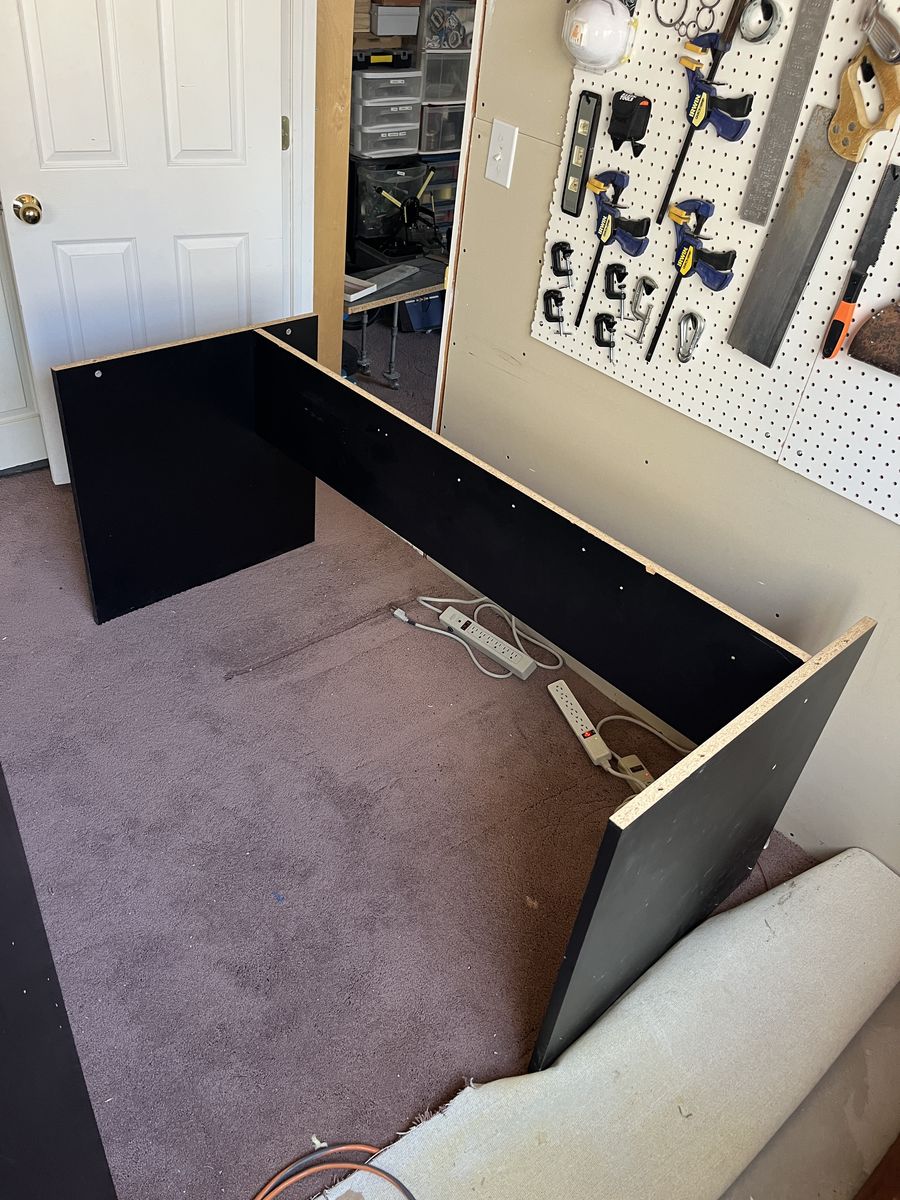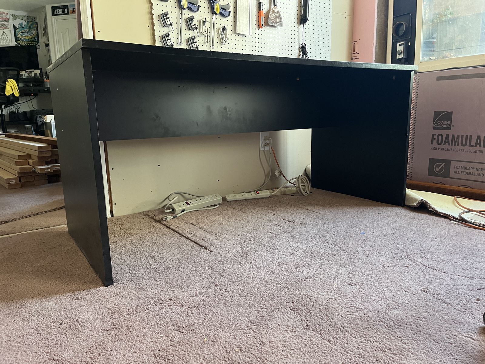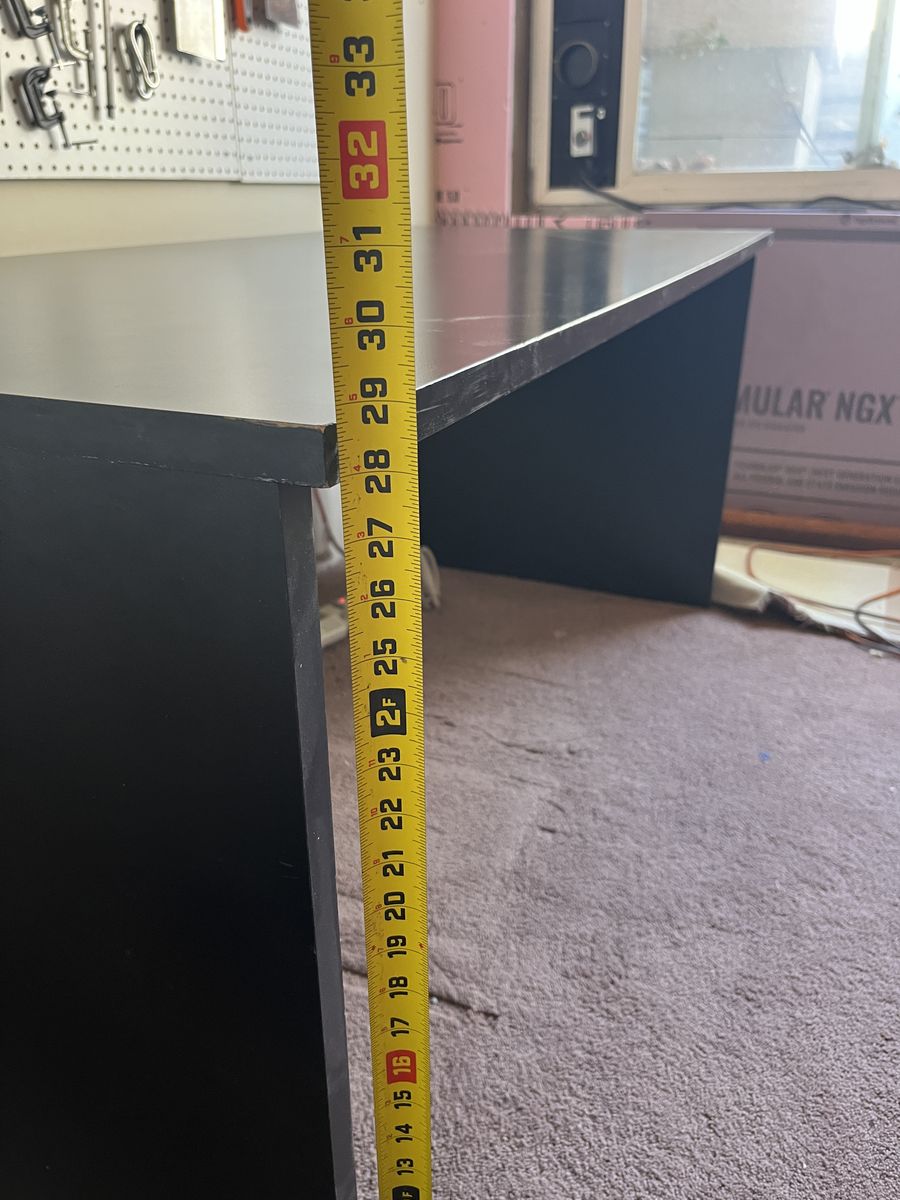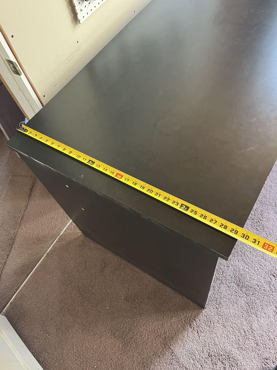 Large black desk in good condition. It is super easy to put together, just 4 screws and 4 cam locks. Top surface has no major gouges, marks, or cuts.