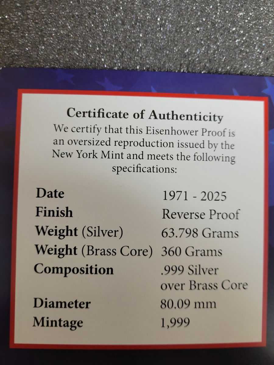 VenmoThe New York Mint produced a limited edition of President Dwight Eisenhower Brass and Silver Grand Heritage GEM Reverse Proof in a collector's case. This is brand new, and is beautiful. With the .999 silver content, it should increase in value over time. Only 1,999 of these were produced.