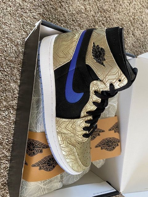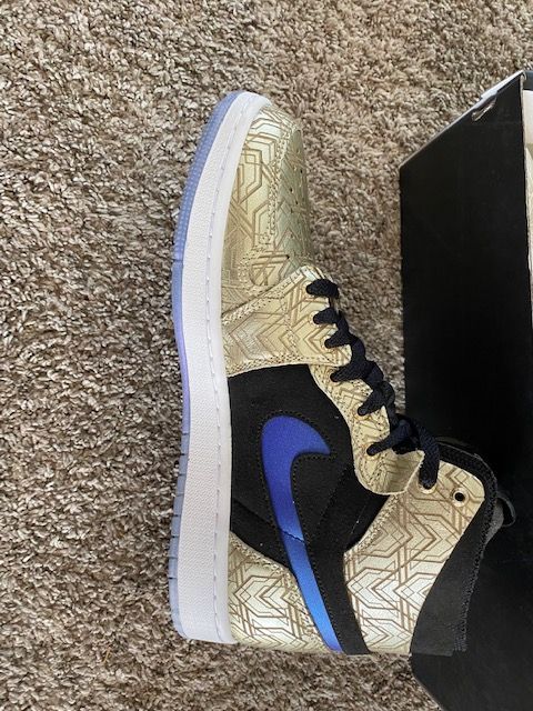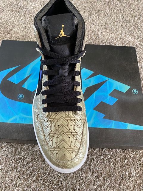 Venmo$190 OBO. These are brand new, never worn, Nike Jordan 1 Gold Laser shoes. The etched gold pattern with the blue Swoosh look amazing. These are mens size 9. Let me know if you have any questions. They are authentic, straight from Nike. The best way to get me is with a text, because I cannot always answer my phone