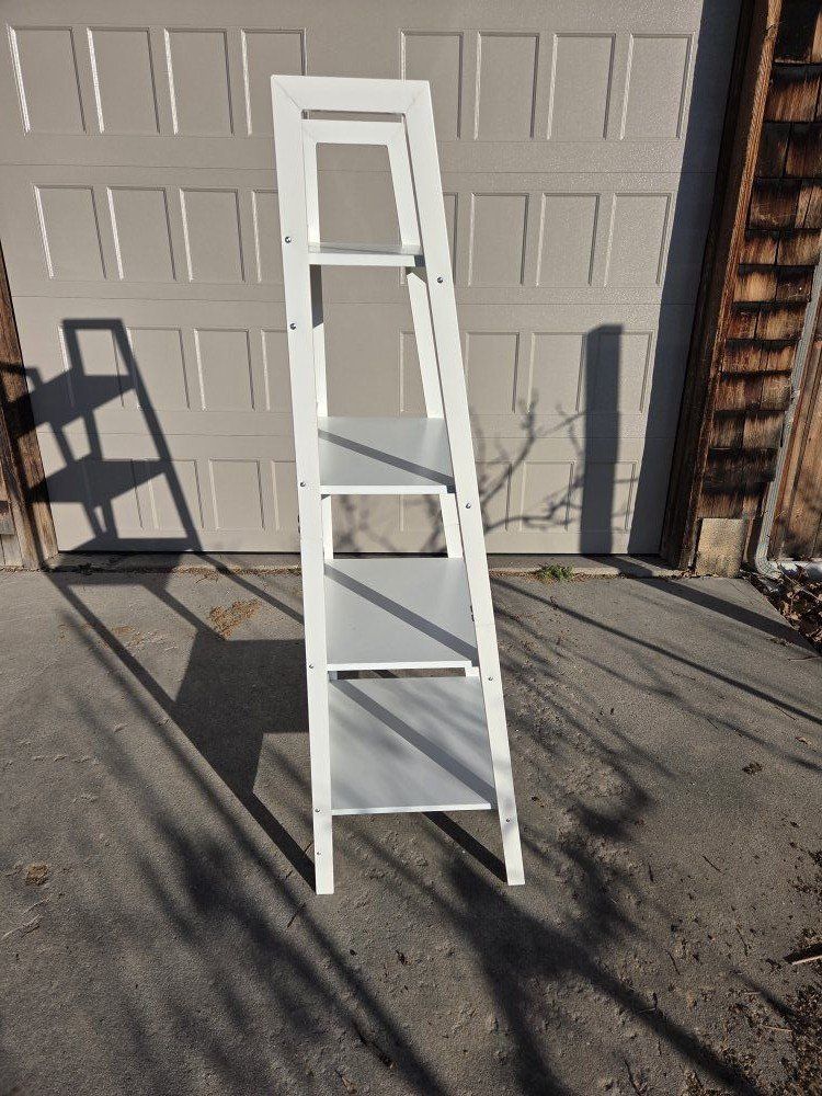 FROM WAYFAIR WEBSITE: "A steel frame in the shape of a ladder holds four shelves made from manufactured wood."
