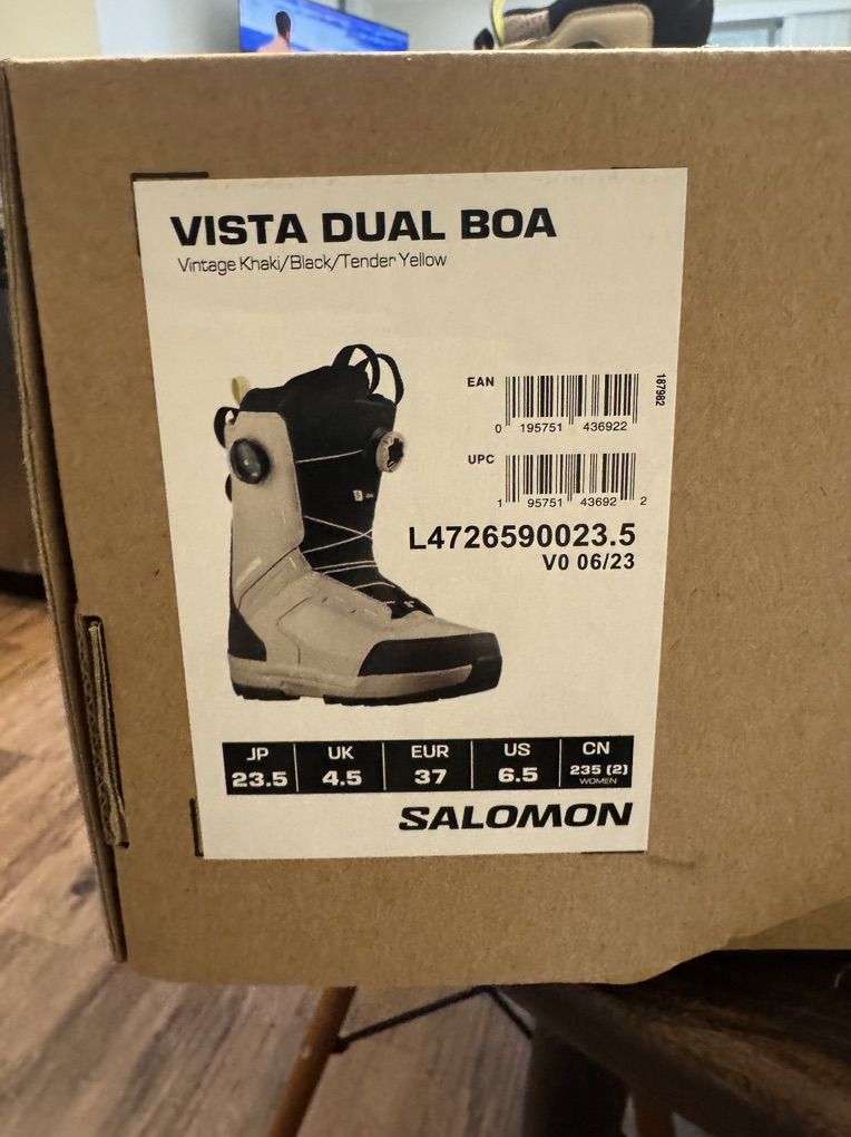 Salomon Vista Dual BOA. Women’s. New in box. Size 6.5. Thought I could get away with this size but they are just two big for me. Perfect condition. I love them. Will be buying the next size down.
