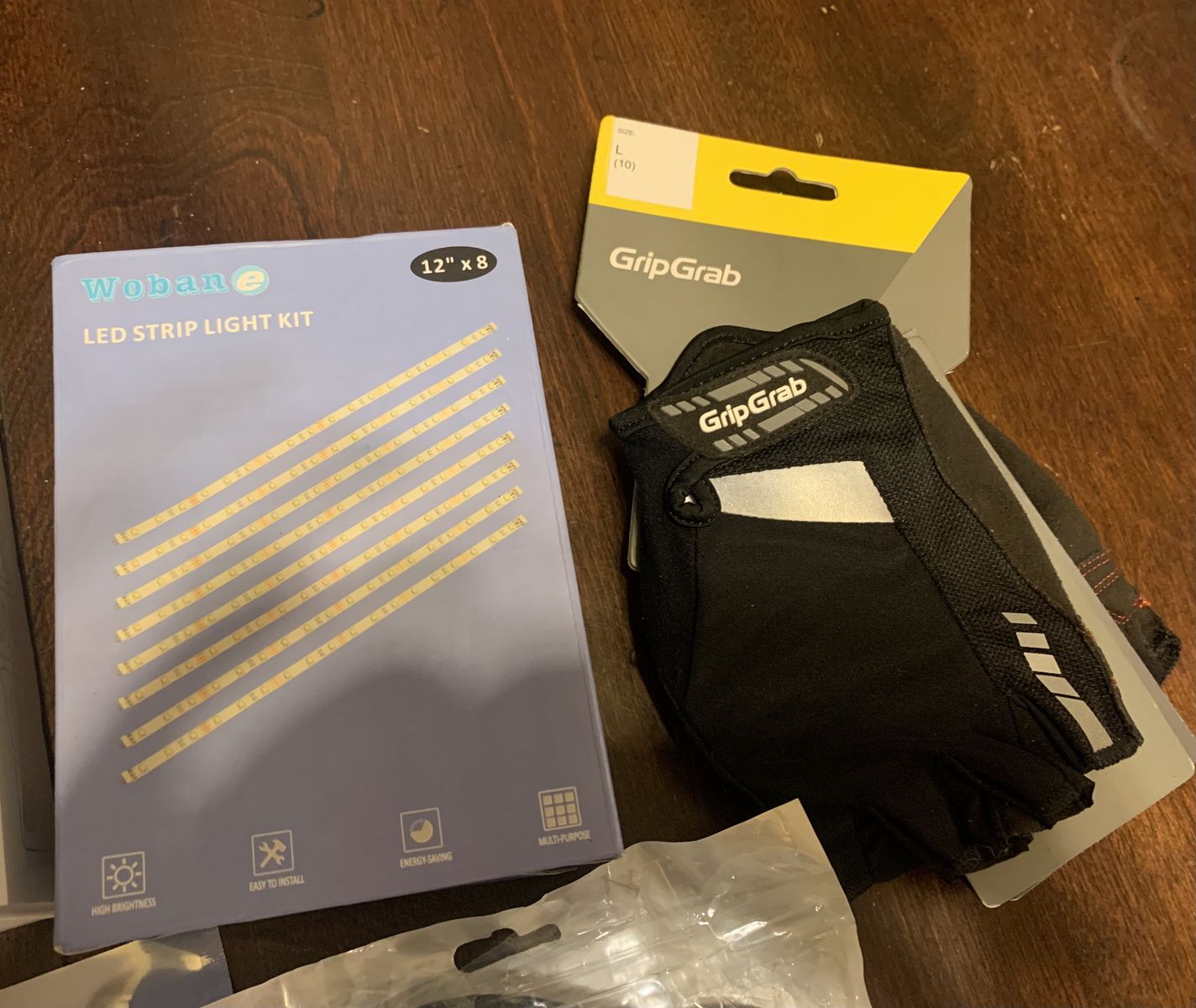 Led strip lights, super hub, hdtv cable, binary hdmi cable, cycling gloves, cell phone arm case