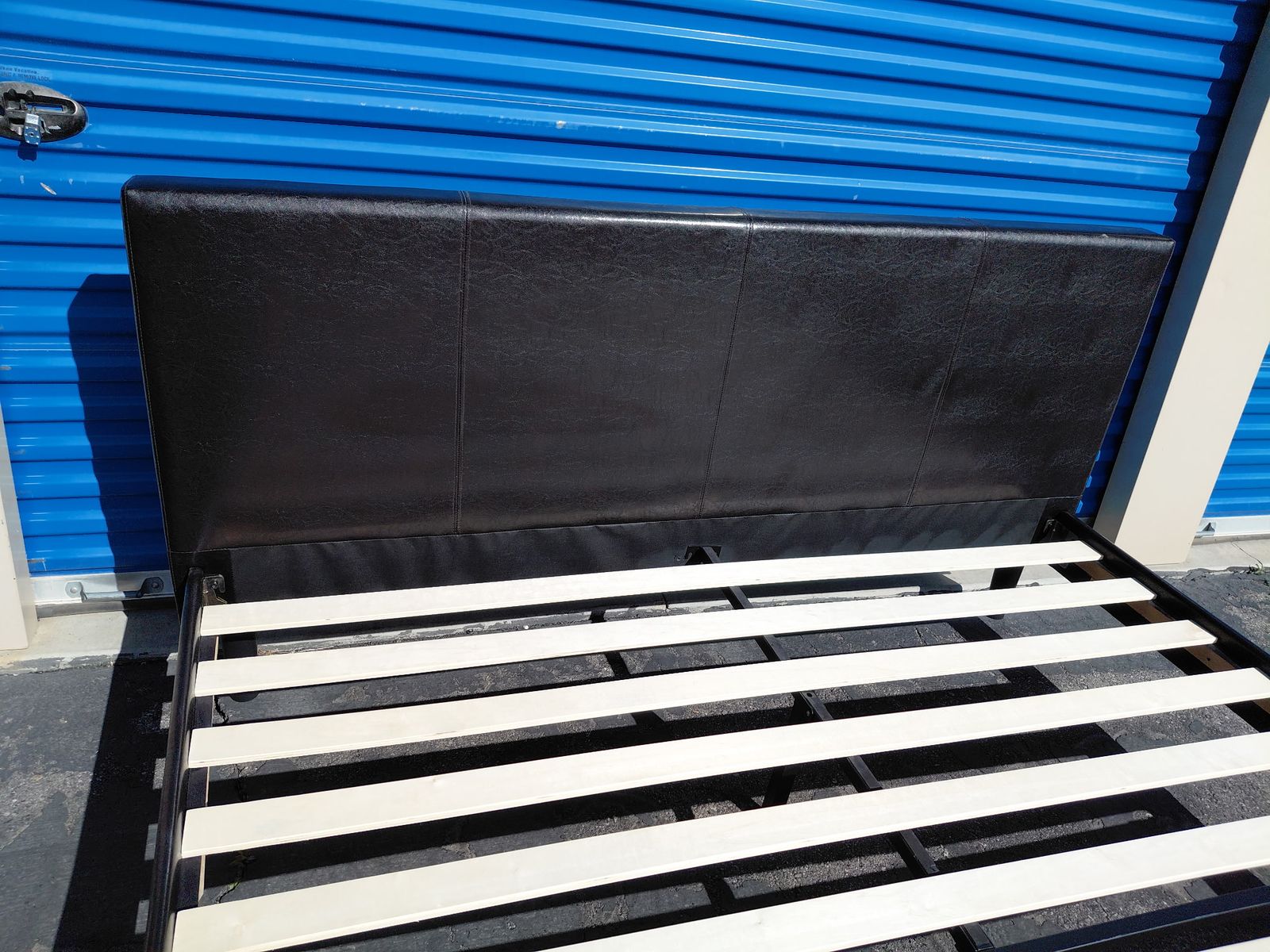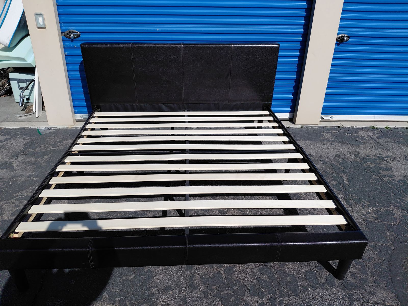 Check out this king faux platform bed. Overall, it is in great condition. There might be some imperfections from moving, a few scratches, and signs of use, etc.