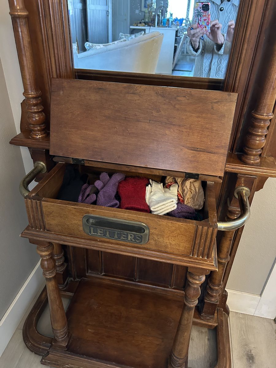 The hooks can be used for hats and coats. Top shelf lifts up for storage. The bottom shelf can be used for shoes and it has a place for umbrellas. 85 inches high at the tallest peak by 38 inches wide.