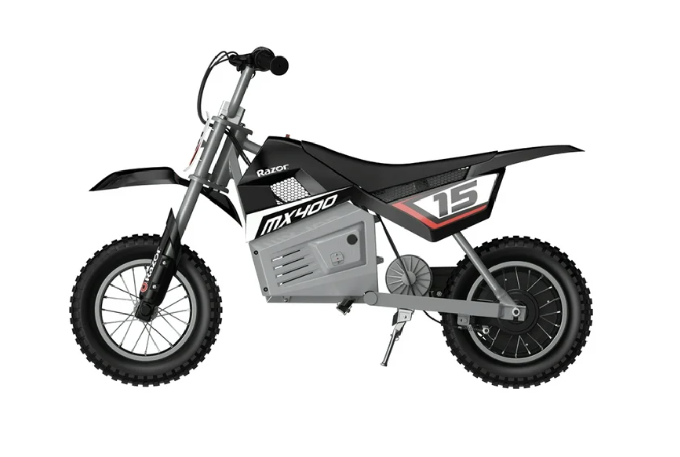 Brand new in box, Razor MX400 Dirt Rocket Electric Bike, Age 8+, 14 Mph, 30-Min Run, 140lb Max, Age/Weight: Recommended for riders aged 8 and up, supporting a maximum weight of 140 pounds for safe operation. Speed/Run Time: Achieves speeds up to 14 mph, offering 30 minutes of continuous high-speed riding or 60 minutes on low speed. Powerful Motor: Features a high-torque, chain-driven motor for smooth and robust off-road performance without gas. Durable Build: Constructed with a durable steel frame, authentic dirt bike geometry, and shatter-resistant fairings for rugged use. Terrain Traction: Equipped with spoked wheels and 12-inch pneumatic knobby tires designed for superior grip on various terrains. Adjustable Comfort: Includes adjustable riser handlebars and soft rubber grips for a customized fit and enhanced rider control. Convenient Features: Boasts folding metal foot pegs, a retractable kickstand, and a hand-operated rear brake for responsive stopping. Rechargeable Power: Powered by a 24-volt rechargeable battery system, with a charger included for easy recharging. 24-volt (two 12-volt) rechargeable battery with charger included Folding metal foot pegs and retractable kickstand for convenience Color: Black Dimensions (L x W x H): 43.7 x 28 x 21.7 inches Weight: 48.26 pounds Designed to deliver just the right amount of power for gentle hills and offroad trails, the Razor MX400 Dirt Rocket is ready for adventure. This ride-on is built to handle dirt paths and backyard fun and is a supercross-inspired electric motocross motorcycle bike that gives young riders the muscle to climb hills and enjoy trails at speeds up to 14 miles per hour. With a high-torque chain-driven rear-wheel drive motor, this bike delivers smooth, rider-focused performance without the mess of gas, so you can go green while you go fast. Comfort and control meet head-on with soft rubber grips, a double-crown fork, and adjustable riser handlebars let you dial in the fit and stay steady on the terrain. Twist-grip acceleration puts the throttle where your instincts are, while hand-operated rear brake bring confident stopping power. Folding metal foot pegs and shatter-resistant fairings add durability for real off-road riding. Keep the good runs coming with the rechargeable 24-volt (two 12-volt) sealed lead-acid battery system delivers up to 30 minutes of continuous ride time per charge on high speed mode while 60 minutes on low speed and includes a battery charger for easy recharging between sessions. Designed for extended play, the MX400 balances power and endurance so you spend more time ripping and less time waiting for a charge. Rugged spoked wheels with 12-inch pneumatic knobby tires bite into dirt, gravel, and grass for superior traction. With a 140-pound maximum rider weight and recommended for kid riders 8 years old and up, the MX400 fits young ones who are ready to step up their game. Some assembly is required but once it’s together, it’s time to leave the pavement behind and own the trail.