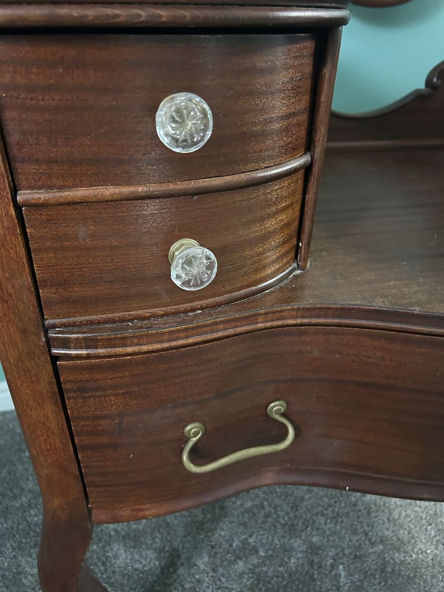 Beautiful wood vanity. Has an oval mirror. Plenty of storage with two small drawers (clear knobs.) and a bigger curved drawer ( brass pulls.) legs have casters, easy to move around. Dimensions are as follows: 39 inches wide, 21 inches deep, 32 inches tall from the drawer to floor, 69 inches tall from the mirror top to floor. The bottom drawer is serpentine.