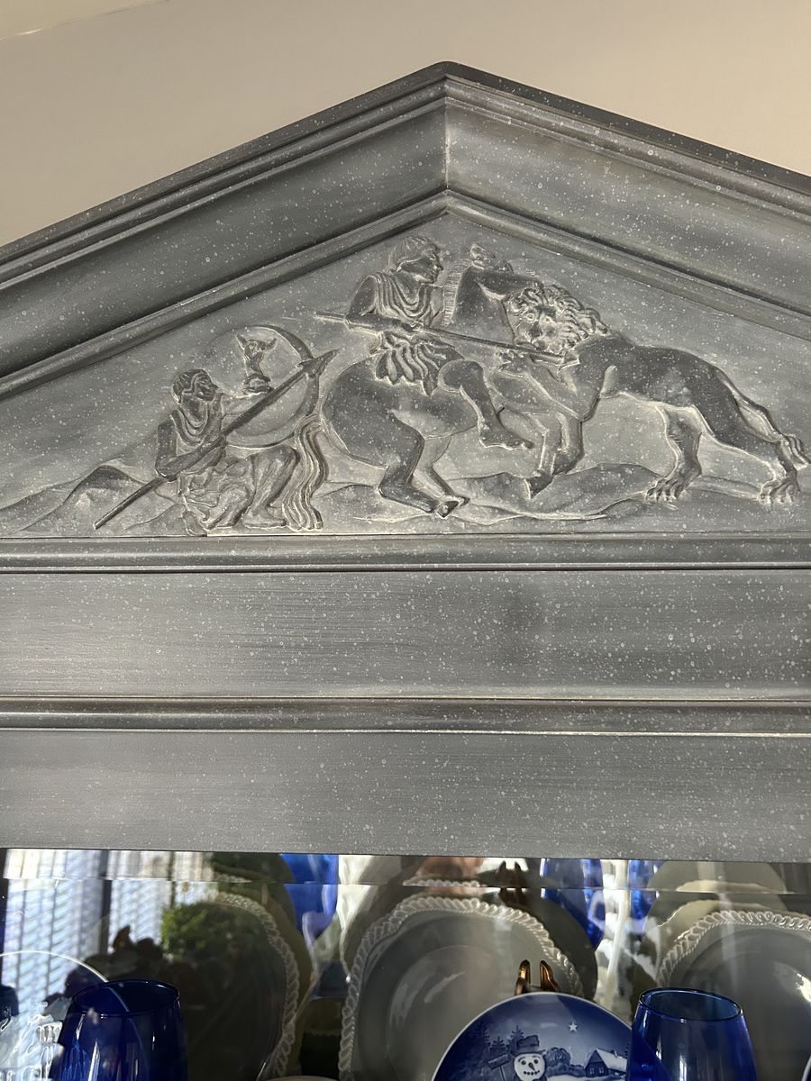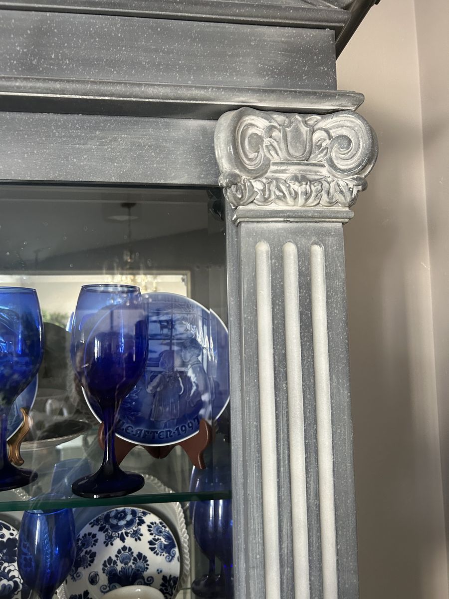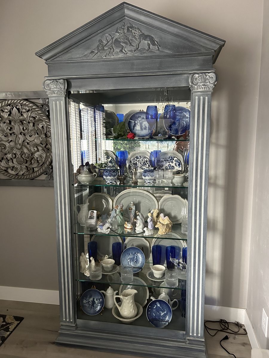 Beautiful China cabinet very unique. The dimensions are as follows at its highest peak. It’s 85“ x 38 1/2“ wide by 15 inches deep. It has four glass shelves plus the very bottom for displaying your beautiful items and collectibles. It is lighted. Cash only.