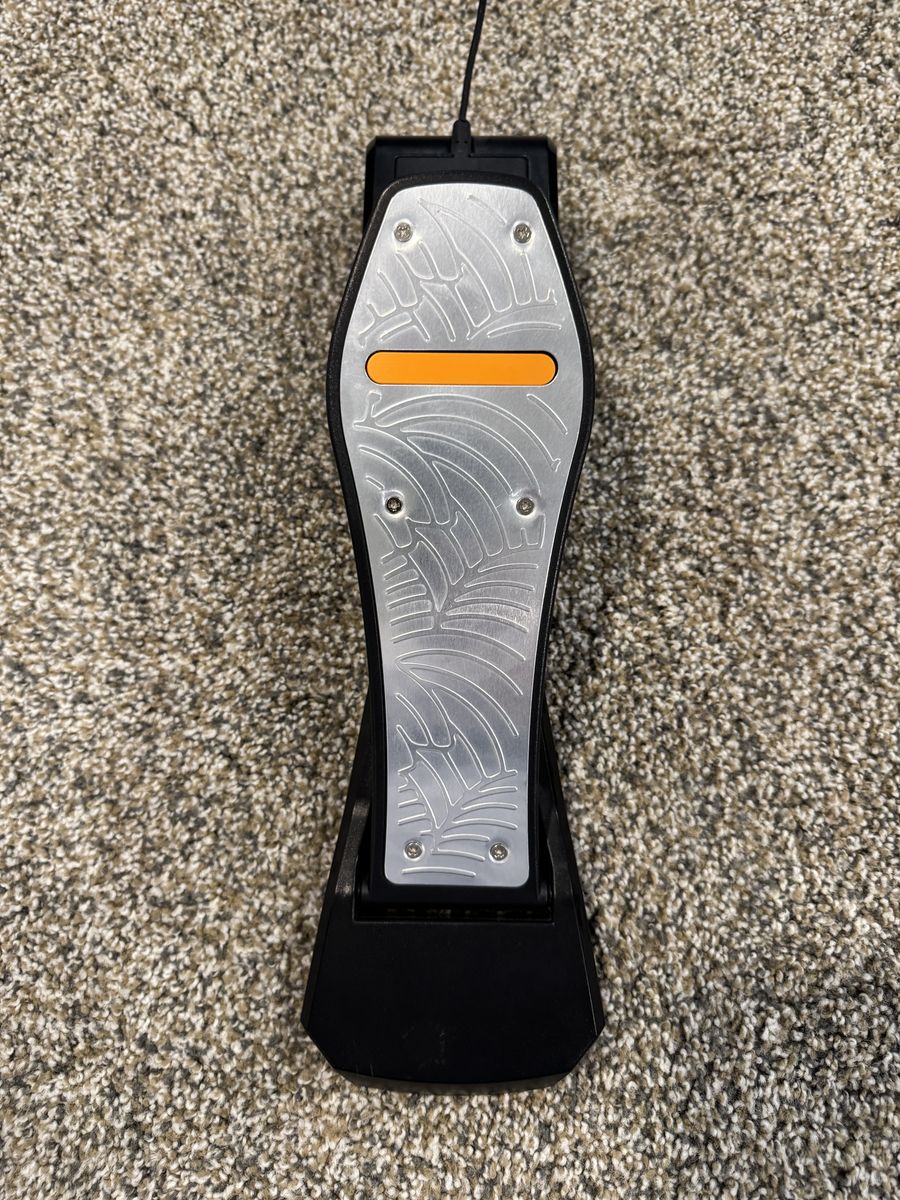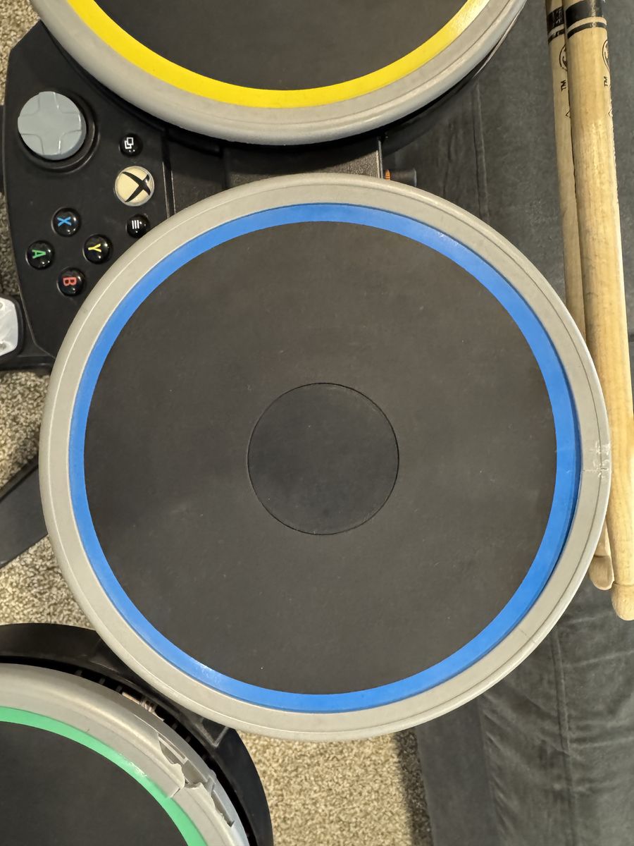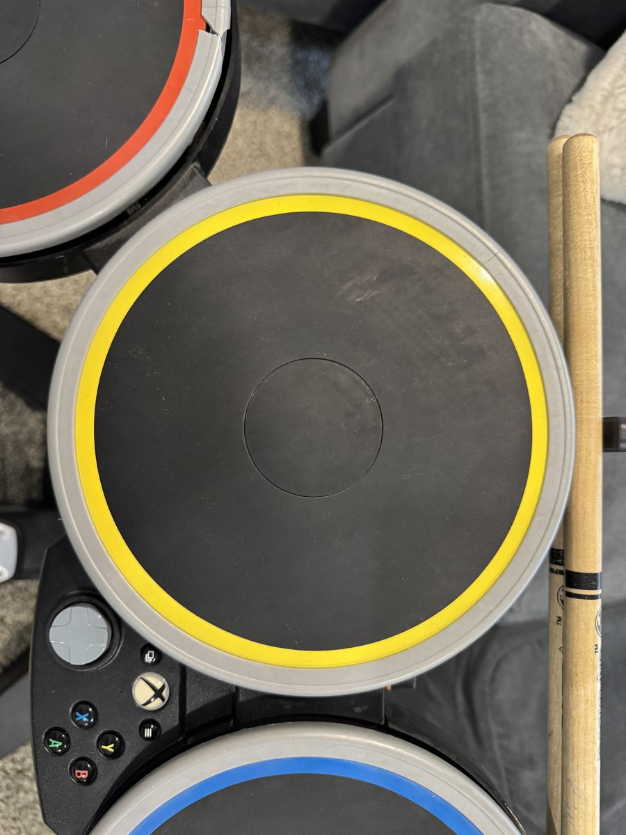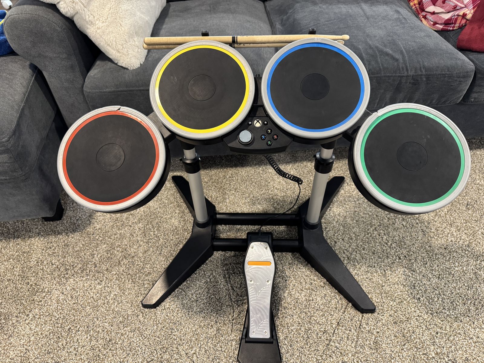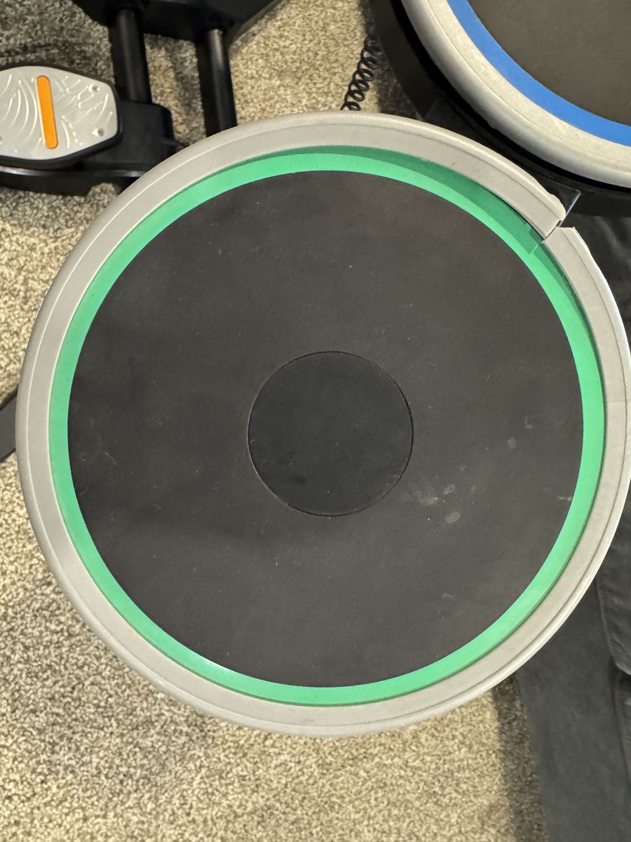Drum set is well used. As can be seen in the pictures, the green and red pads have some damage on the outer plastic ring. However, the drums are 100% functional and responsive. The pedal is in excellent condition. Drum sticks included are the original rock band drum sticks. The drum stand height can be adjusted as well.