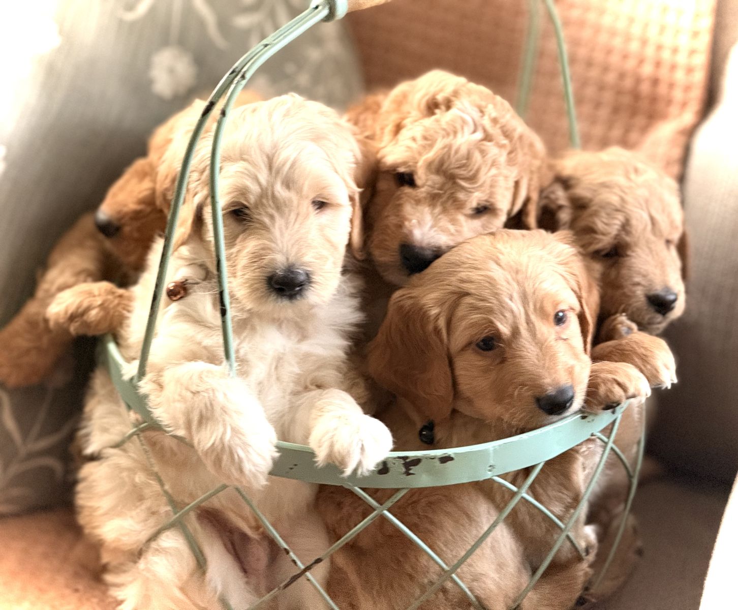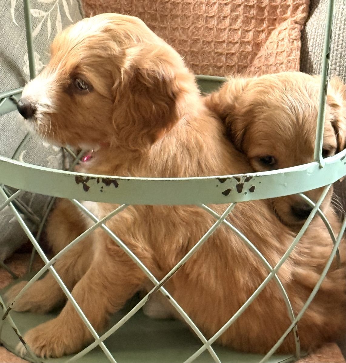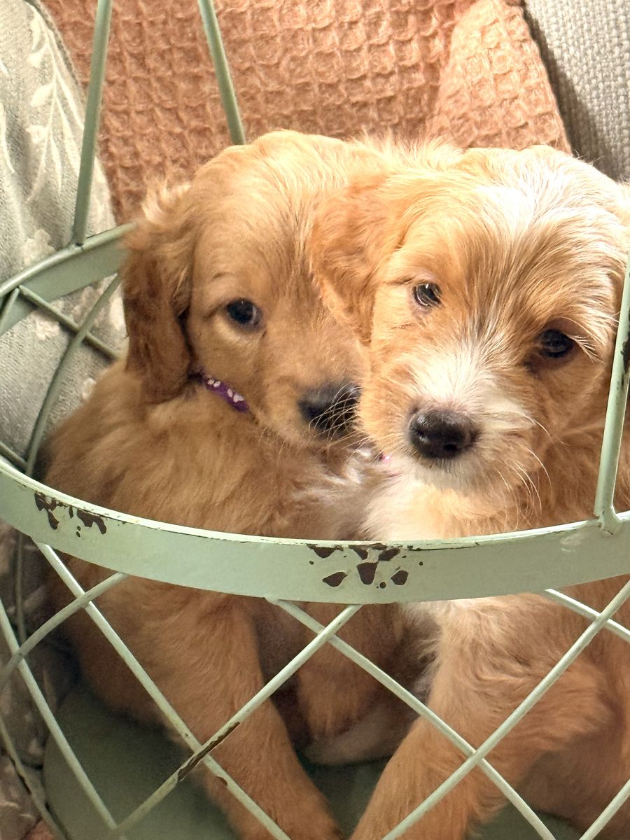 · F2 mini Goldendoodles have beautiful soft coats with gorgeous colors/markings. · Mom & dad are F1 Mini Goldendoodles and are health tested and genetically clear for OFA hips, elbows, heart, & patella through Embark.