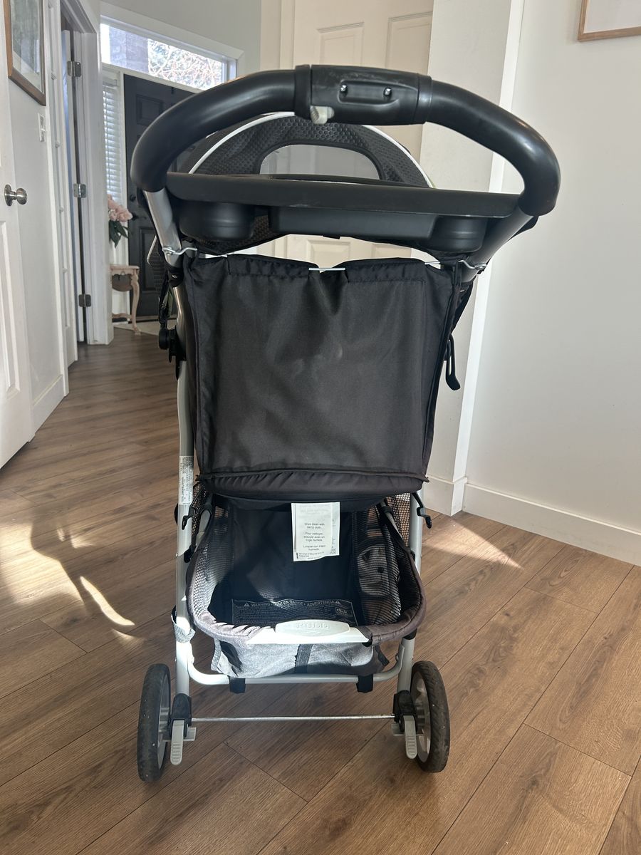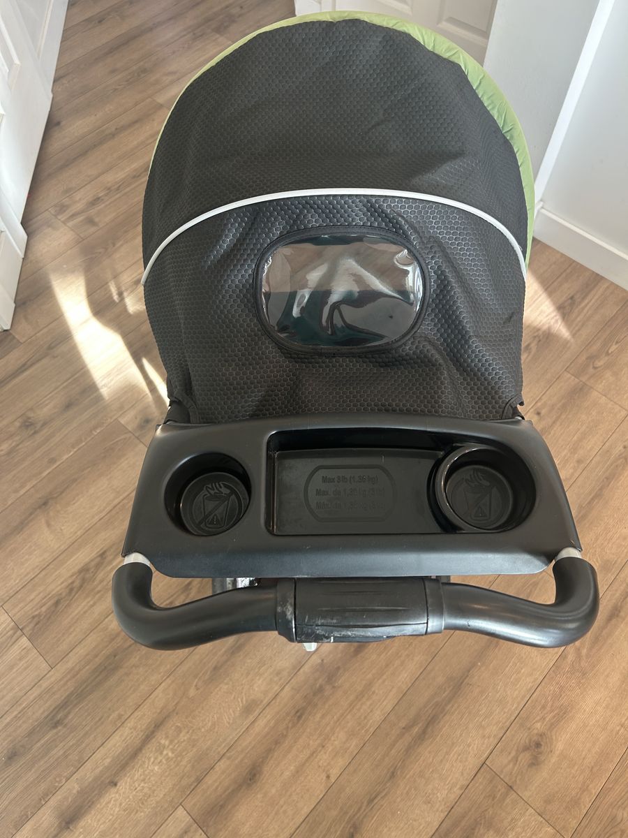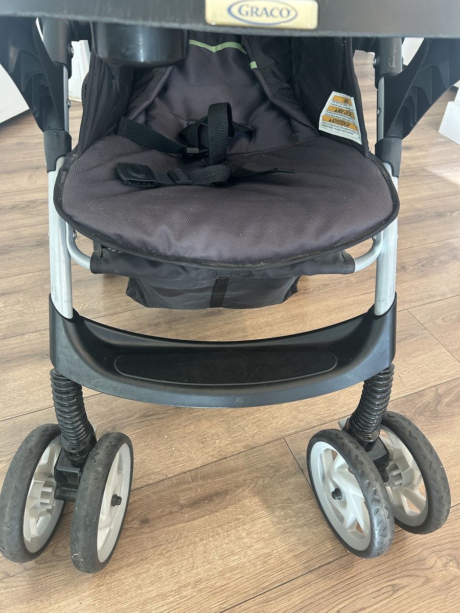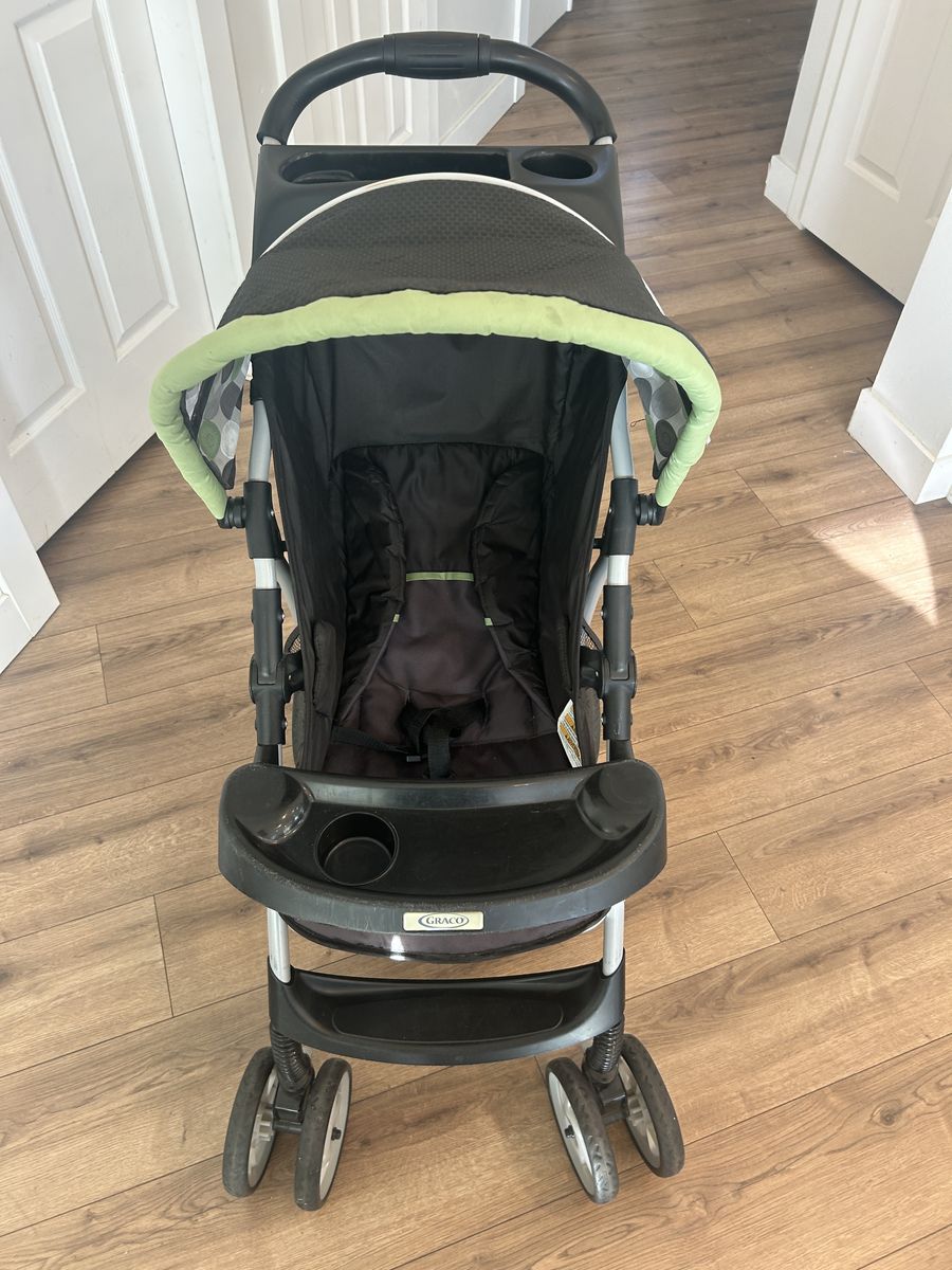 VenmoGraco basic lightweight foldable stroller. Folds up with one hand. Smooth and quiet wheel motion. Two position reclining seat with simple webbing and plastic buckle harness to strap in baby. Canopy with clear view “window” to visualize baby. Cup holder in baby’s tray and 2 parent cup holders above. Stroller used for Grandkids only occasionally over the past several years. No fabric tears or stains or broken parts. Great condition! Only a few scratches on some of the plastic from storage/stacking.