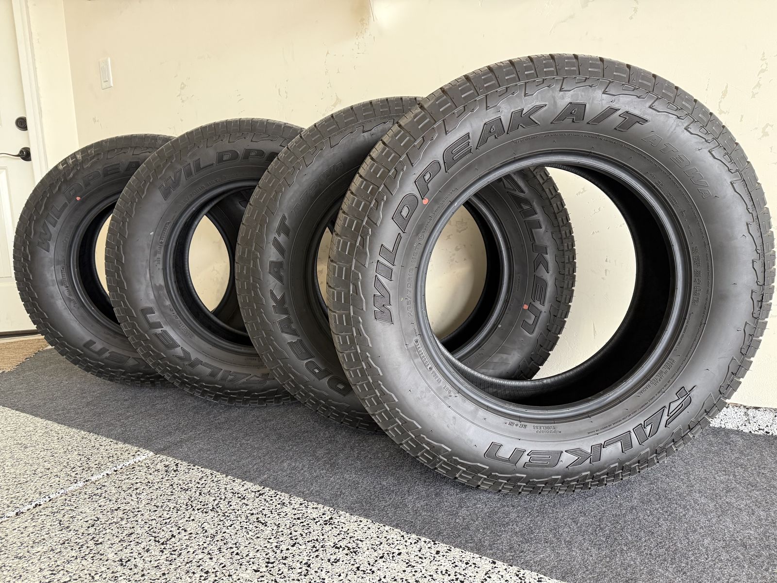 PayPal4 Falken Wildpeak AT3WA Size 265/70R16. 1626 miles, current tread depth 8/32nd. This set came stock on 2025 Toyota 4Runner just purchased. Tire Rack new price comparison $269.39 per tire. Cash only. $700 for all four tires. Possible PayPal Option. TBD