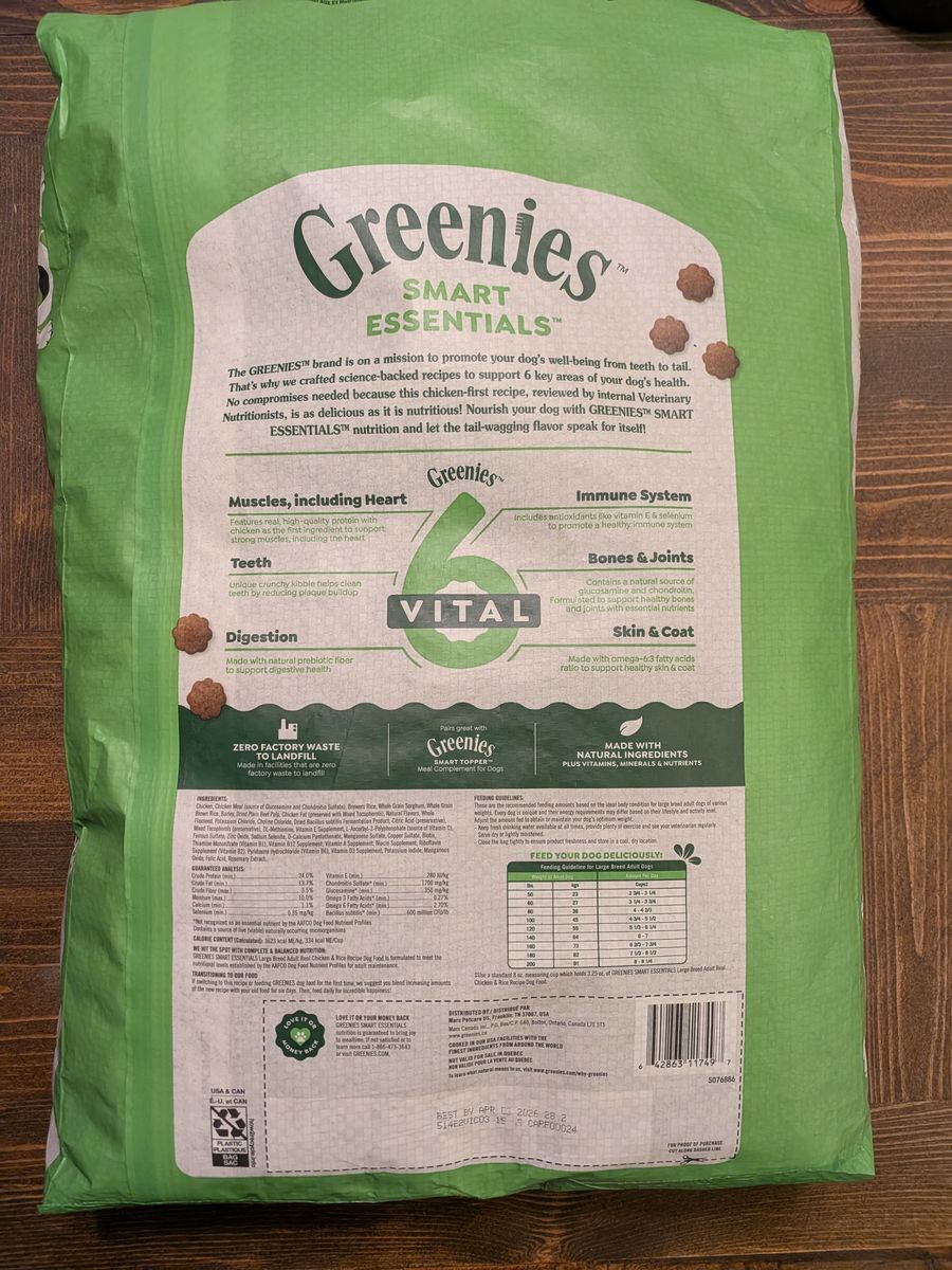 Product Details Brand: Greenies Smart Essentials Type: Large Breed Adult Dry Dog Food Recipe: Real Chicken & Rice Weight: 15 lb (6.80 kg) Key Features: Probiotics, no corn/wheat/soy, natural source of glucosamine/chondroitin for joints.