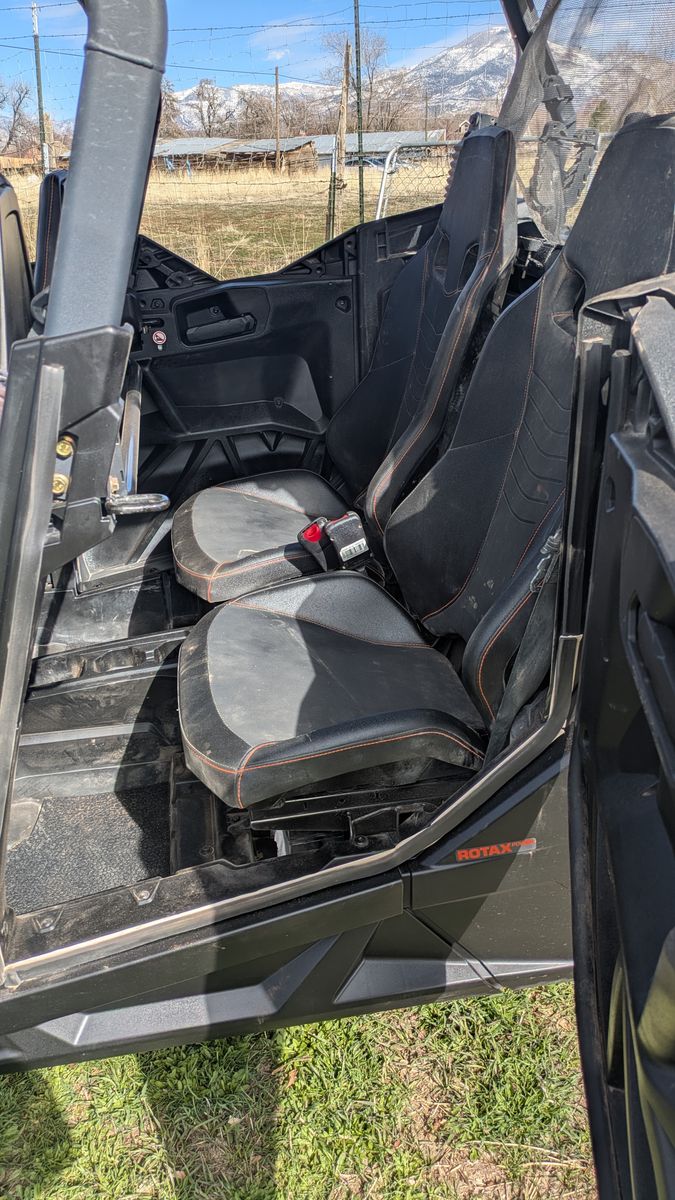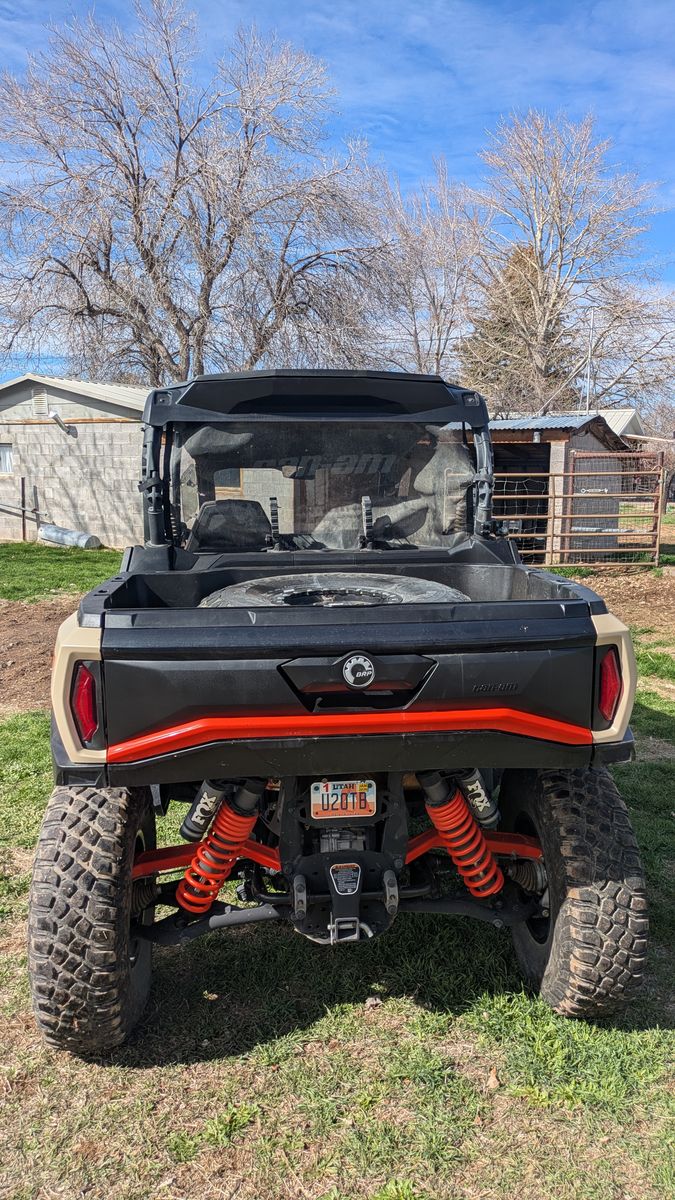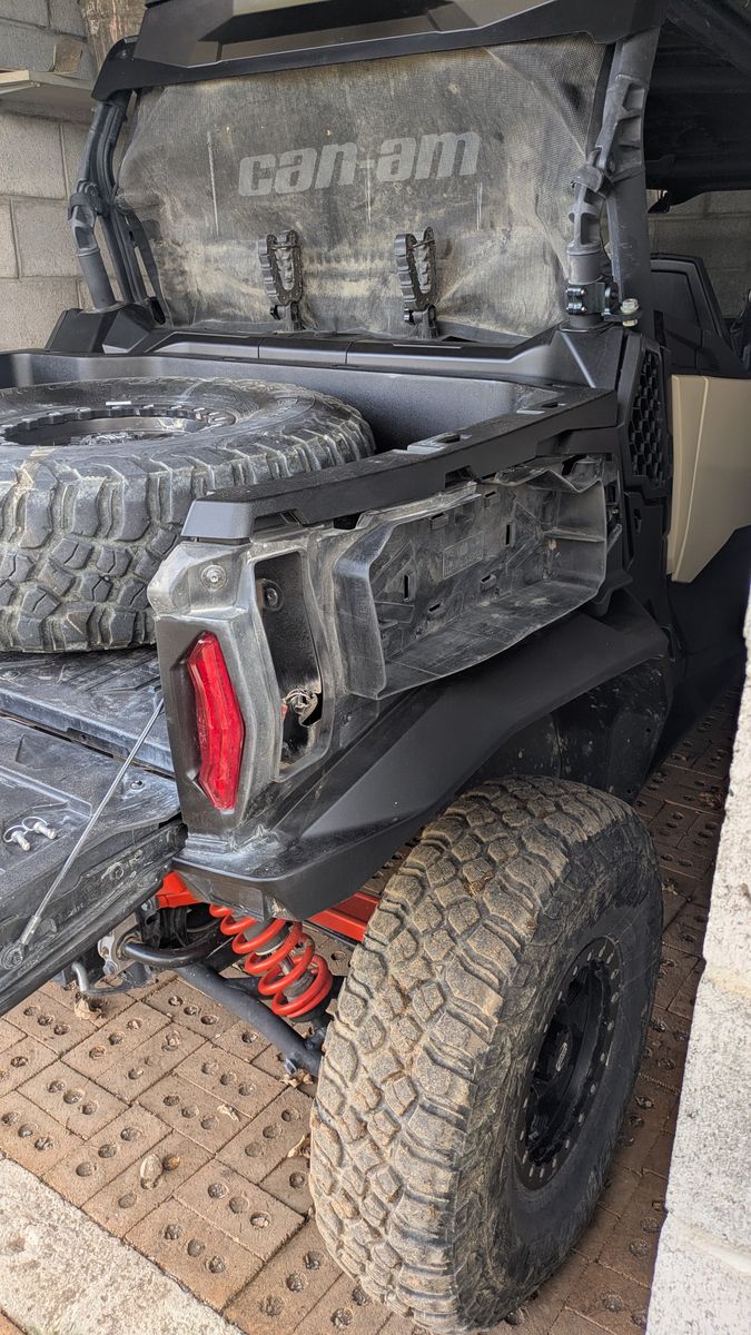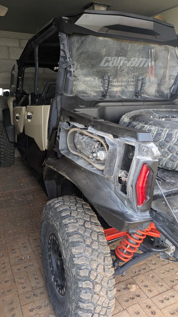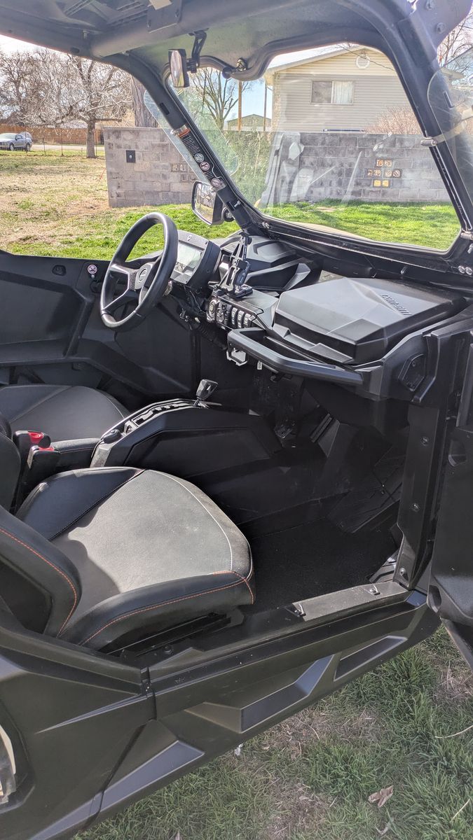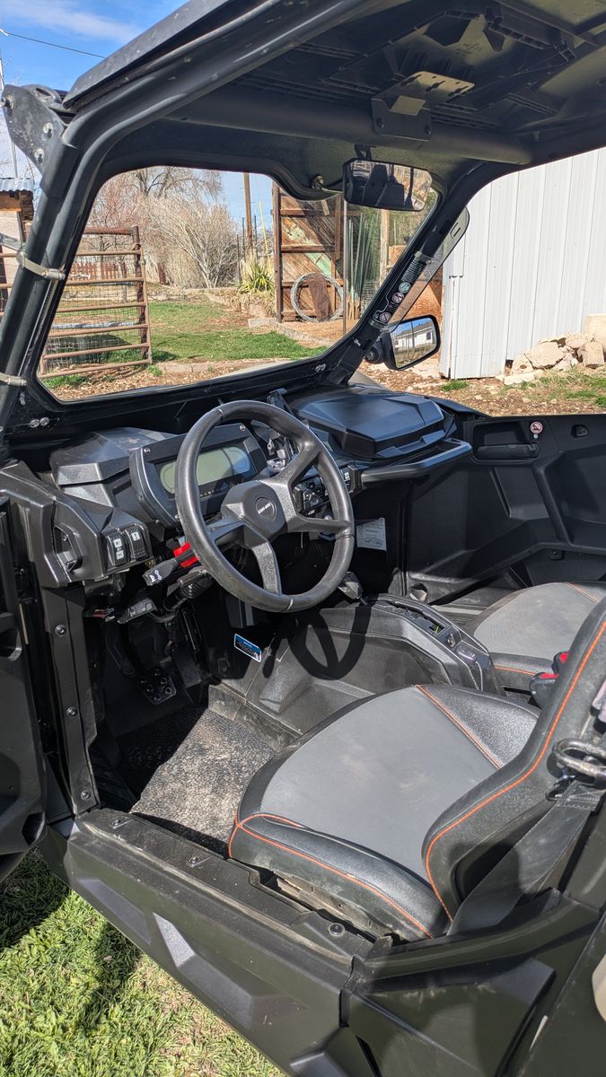 It's got Tusk beadlock wheels with 32-inch BF Goodrich tires and a matching spare. I rotate the spare in when I rotate the tires, so all the tires have some wear. They still have tons of life in them. I put an Aftermarket Assassins secondary clutch kit in it to restore the power loss from the larger tires. I also have the original clutch still in a box that is included. It’s got a Dirt Warriors glass windshield with vents in the bottom, with USA wind deflectors to bring more air into the cab. The light bar is a Rough Country black series 40-inch bar. It has a street-legal kit installed. The side mirrors are Siezmick brand, which have lifetime warranties, so you can send the broken driver's mirror in and get a new one. It broke from a rock being flipped up while trailering it, and I never got around to fixing it. The winch is the Can-Am winch that came with the machine. I put a heavy-duty gun rack on the back that I used to hold a Hi-Lift jack, which was very sturdy. There is a rear Can-Am screen that helps with dust. There is also a phone mount that holds your phone very securely while on trails. I cut out some thick rubber floor mats to help the dust not come up through the drain holes in the floor. I’ve got a spare belt, Can-Am tool kit, and clutch spreader in the bedside storage. The air filter is an upgraded K&N washable/reusable air filter. I’ve followed the Can-Am “Severe Duty” maintenance schedule and kept the logs in the owner’s manual. I have had no issues with this machine.