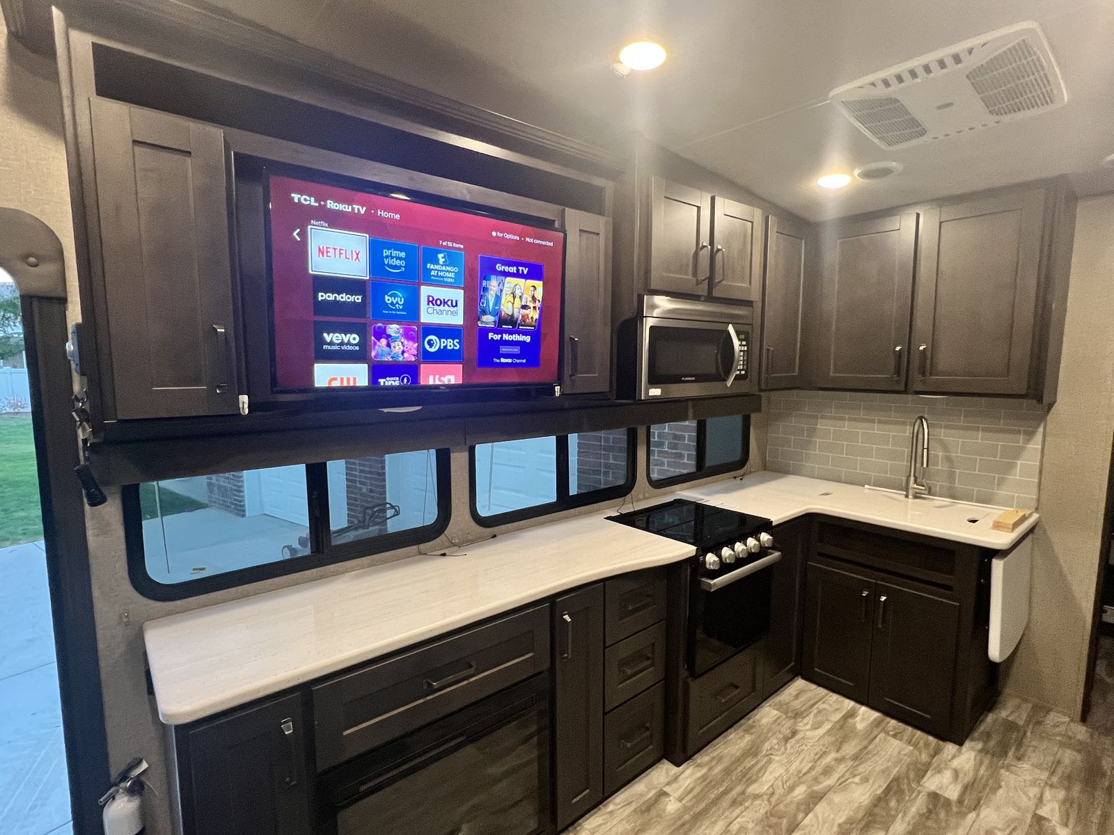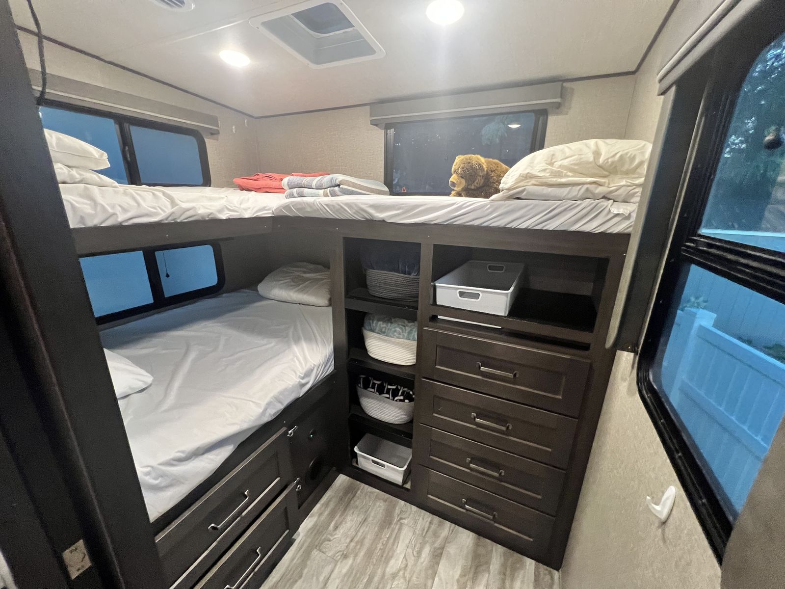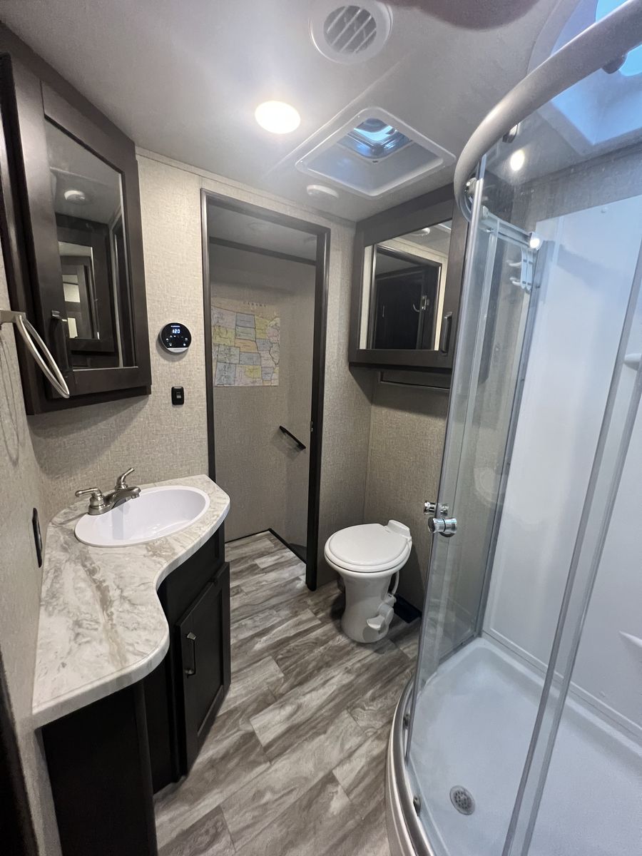 ZelleThis beautiful, modern fifth wheel features an awesome triple bunk room in the rear and 2 slide-outs. U-shaped banquette Dual grey tanks 50 Amp Service 2 rooftop AC units Electric fireplace Auto Self Leveling Nautilus plumbing system Many more features - come check it out! Includes Anderson hitch ($1,200 value)