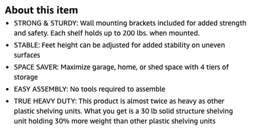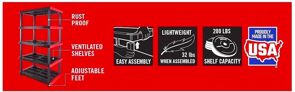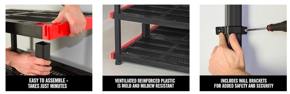 Heavy duty, easy assembly shelves.