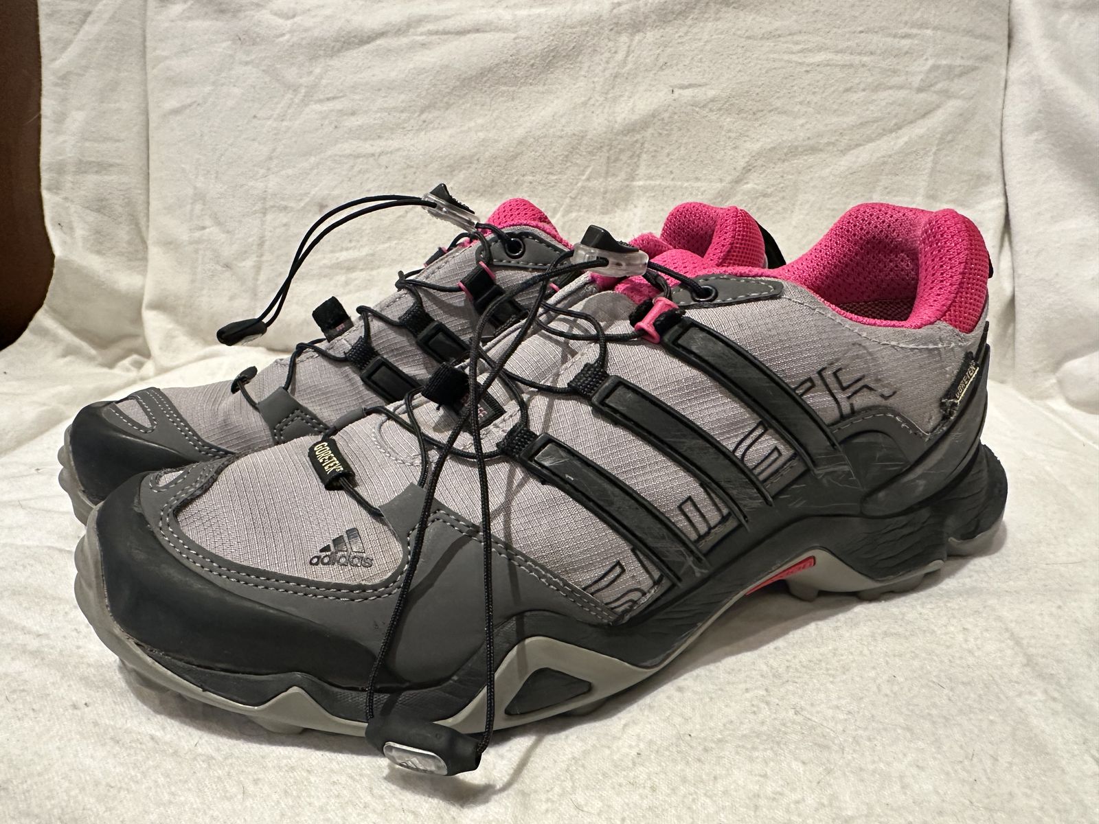 Adidas women’s size 9 gray with hot pink trim Gore-Tex hiking shoes. These are in excellent condition, see photos for details. I take cash or Venmo, but cash is preferred. Text is best. 801-201-4446. Check out my other ads for additional sizes and styles.