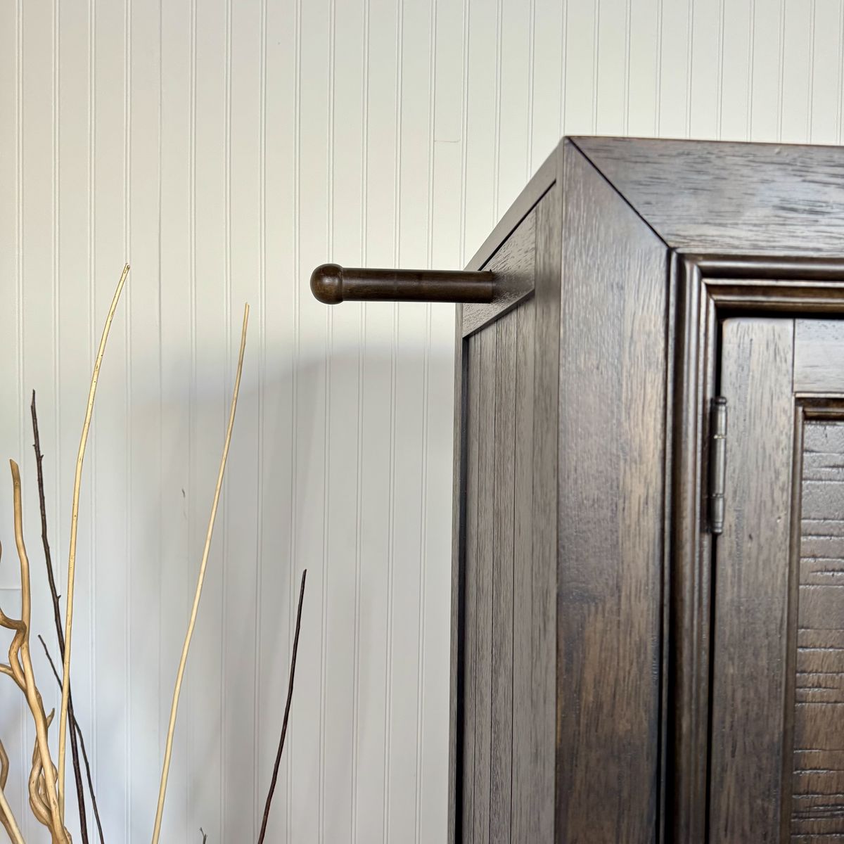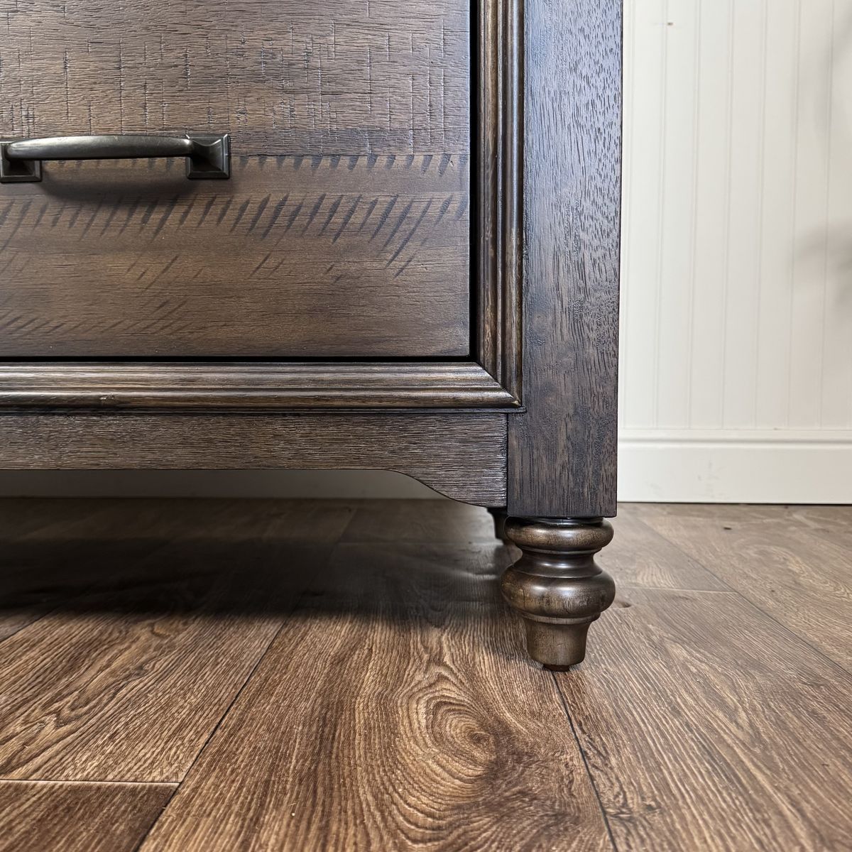 The warm peppercorn finish and rustic wood grain give it a timeless look that works well in traditional, farmhouse, lodge, or modern rustic interiors.