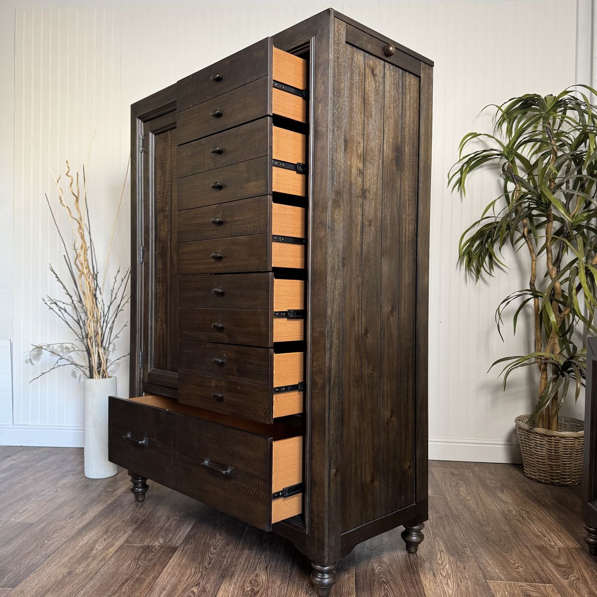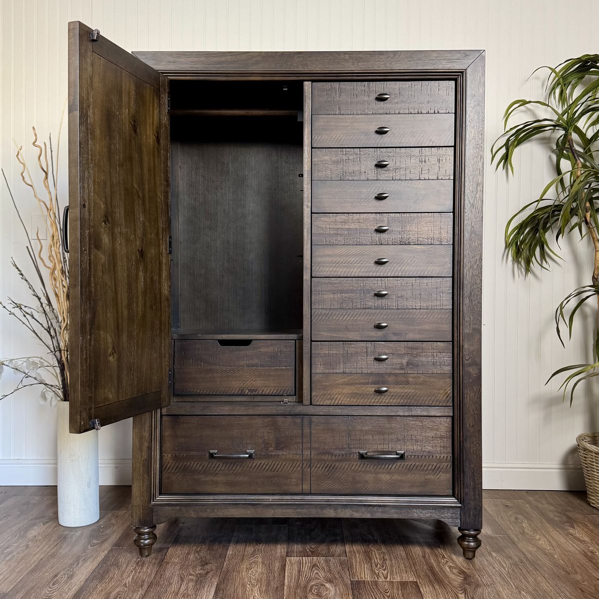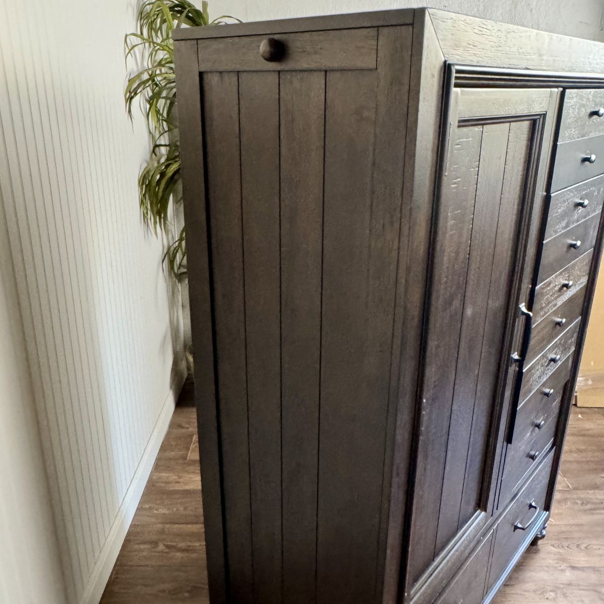 VenmoBeautiful real wood wardrobe armoire by Liberty Furniture from the Catawba Peppercorn collection. Unlike most armoires, this one combines a wardrobe for hanging clothes with multiple drawers for folded items, so it works as both a dresser and a closet. Two large bottom drawers provide additional storage. On each side is a built-in pop-out valet rod that can be extended for additional hanging space and pushed in when not needed. Great for homes that need extra closet space.