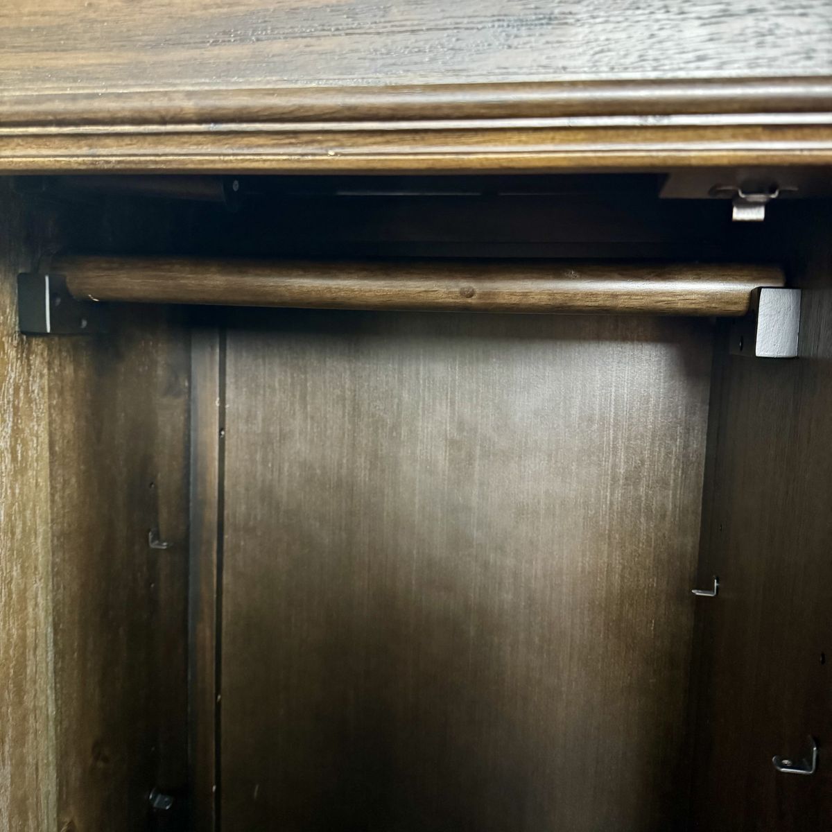 The cabinet with a hanging rod also includes brackets for shelves so it could easily be transformed into a linen press, game closet, or a craft or office cabinet (shelves not included).
