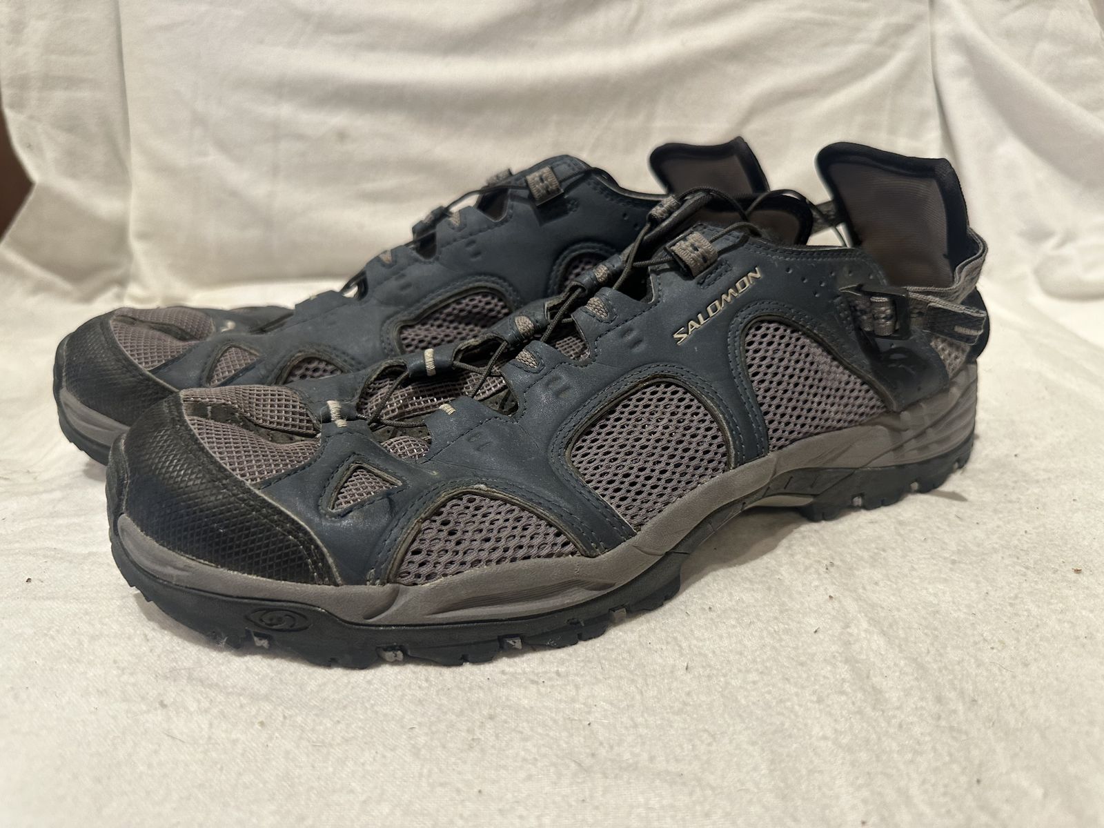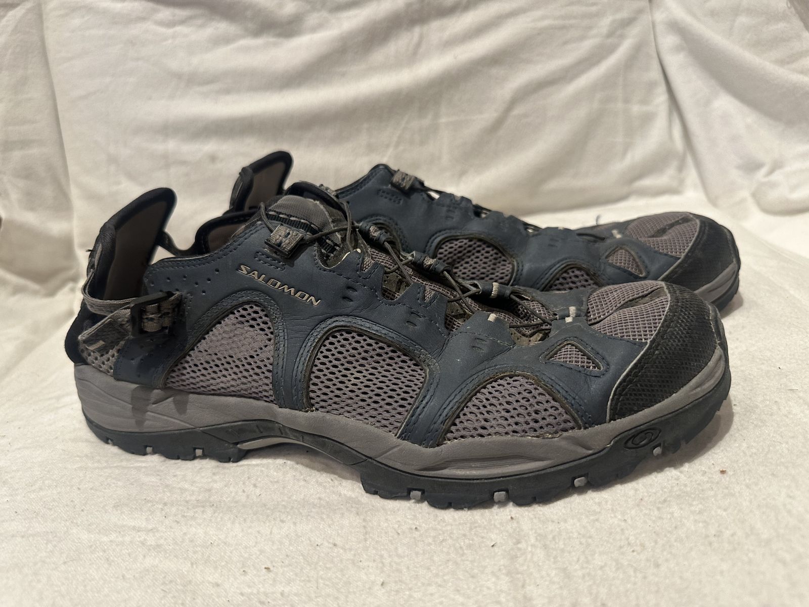 Salomon men’s size 12 blue/grey water, shoes or sandals. These have corded laces and a straps on the back for an adjustable fit. They’re in good condition, see photos for details. I take cash or Venmo, but cash is preferred. Text is best. 801-201-4446. Check out my other ads for additional sizes and styles.