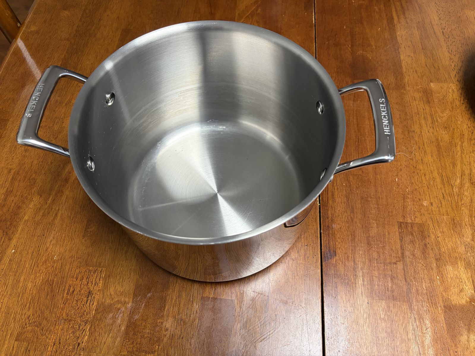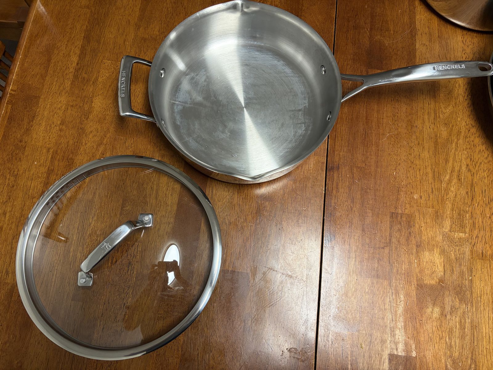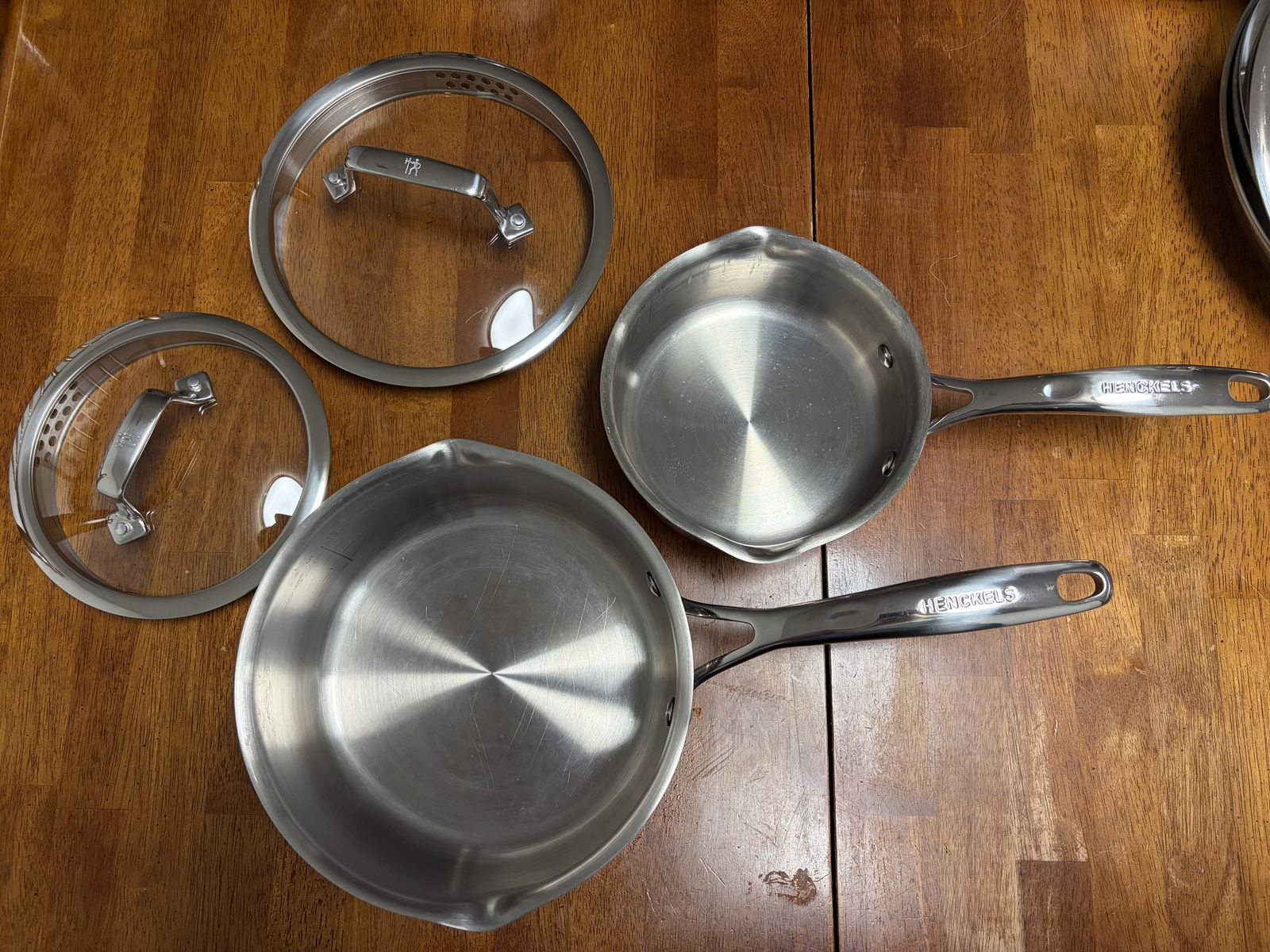 Brand: Henckels Material: stainless steel Pans: 8in, 10in w/lid, 12in w/lid Pots: 1.3qt w/lid, 2.5qt w/lid, 6.5qt (10in lid fits) Skillet: 10in diameter x 2.5in depth w/lid