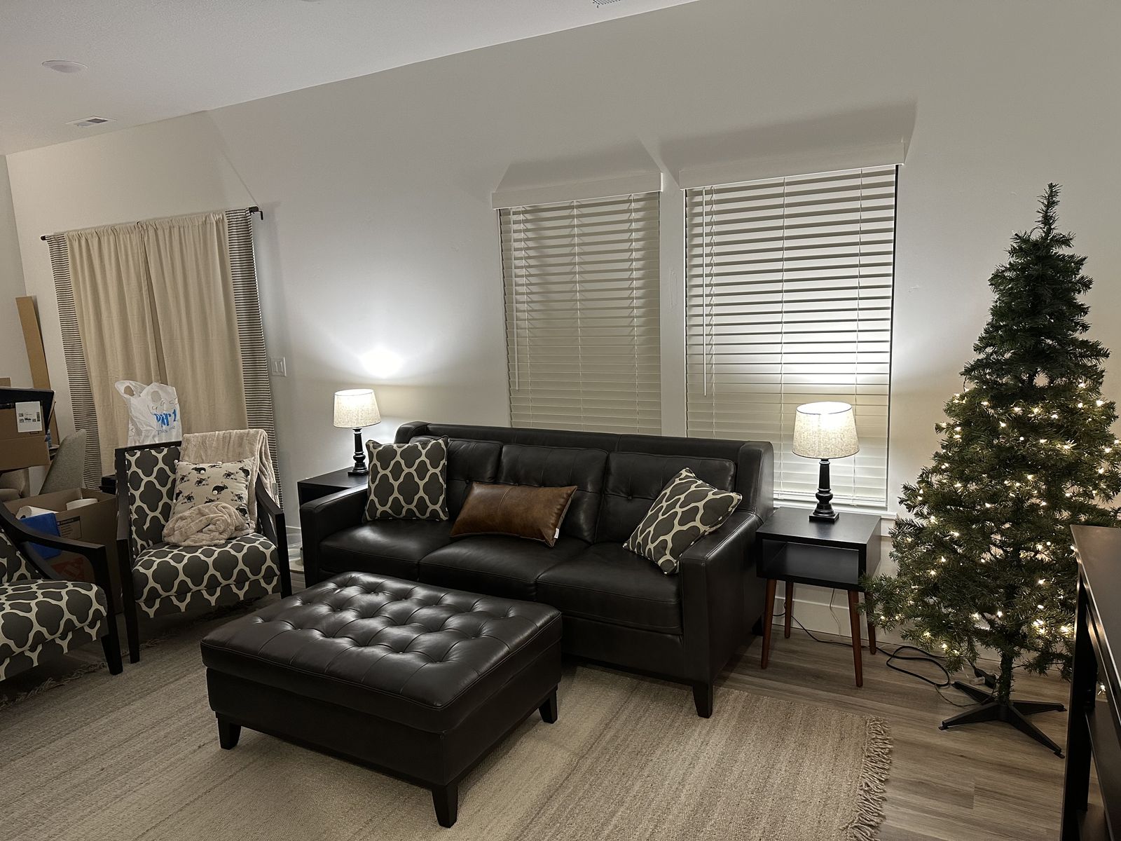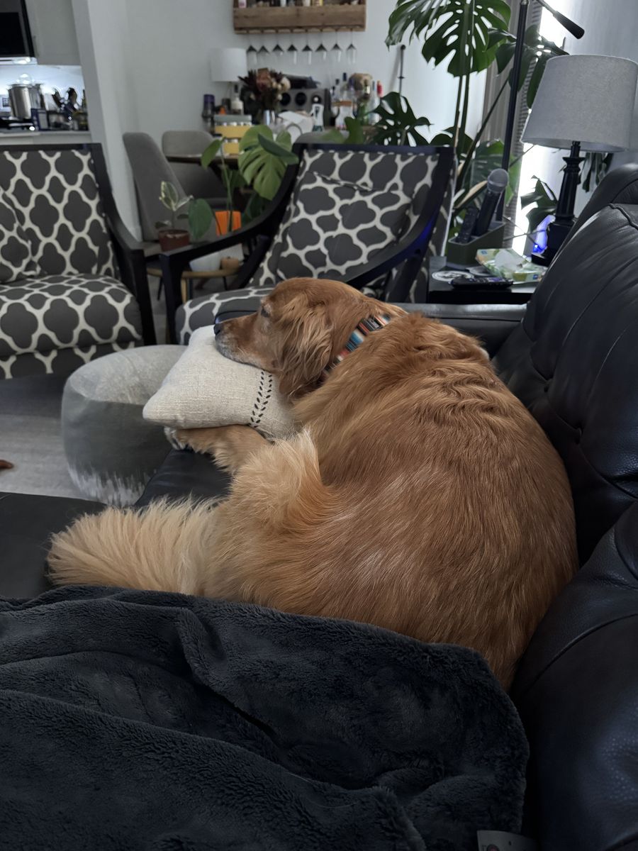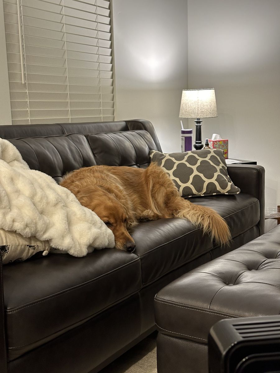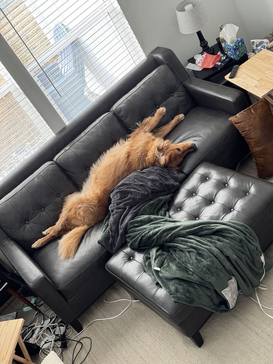 Priced to sell, as we have scheduled delivery of a sectional this week. The reason we’re selling is because our golden retriever (pictured) prefers a sofa with back cushions she can climb and lay on top of. That’s it, that’s the whole reason. With that said, yes, we do have a golden retriever. She has always been fully potty trained and has never had accidents or caused damage, but despite my best efforts, it’s likely you’ll find a few dog hairs. I apologize in advance as I have done my best to get them all. This set would do lovely in a home with dogs, though, as the leather is very easy to keep clean.