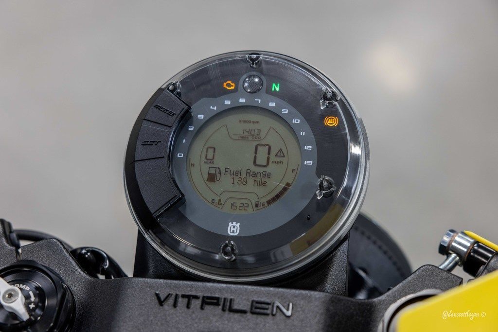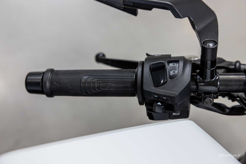 Clip-on handlebars attach to forged aluminium triple clamps, a central focal point to the Vitpilen 401. In keeping with the minimalistic look and authentic design, the control zone is not obstructed by any fairings and features a digital display unit with the necessary information.