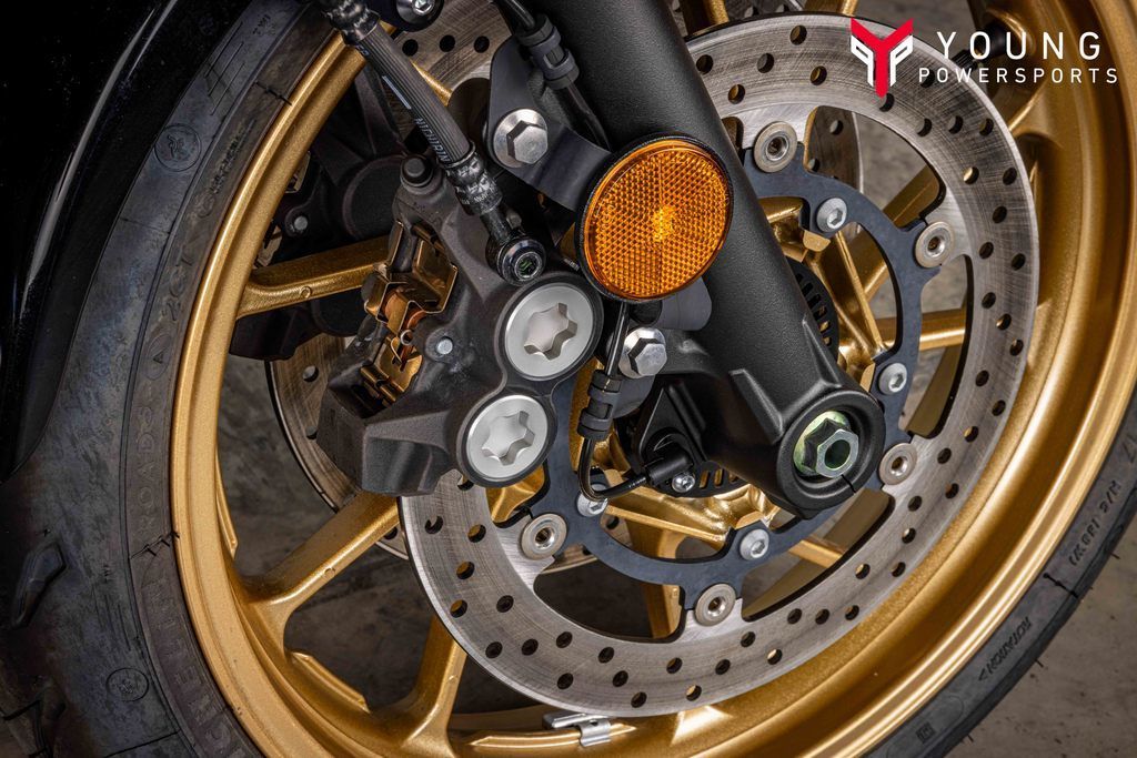 Heritage-inspired round LED headlight provides modern lighting performance with classic style, while integrated headlight stays connect into the fork shrouds for a compact front expression and a sleek -˜snub-nose look.