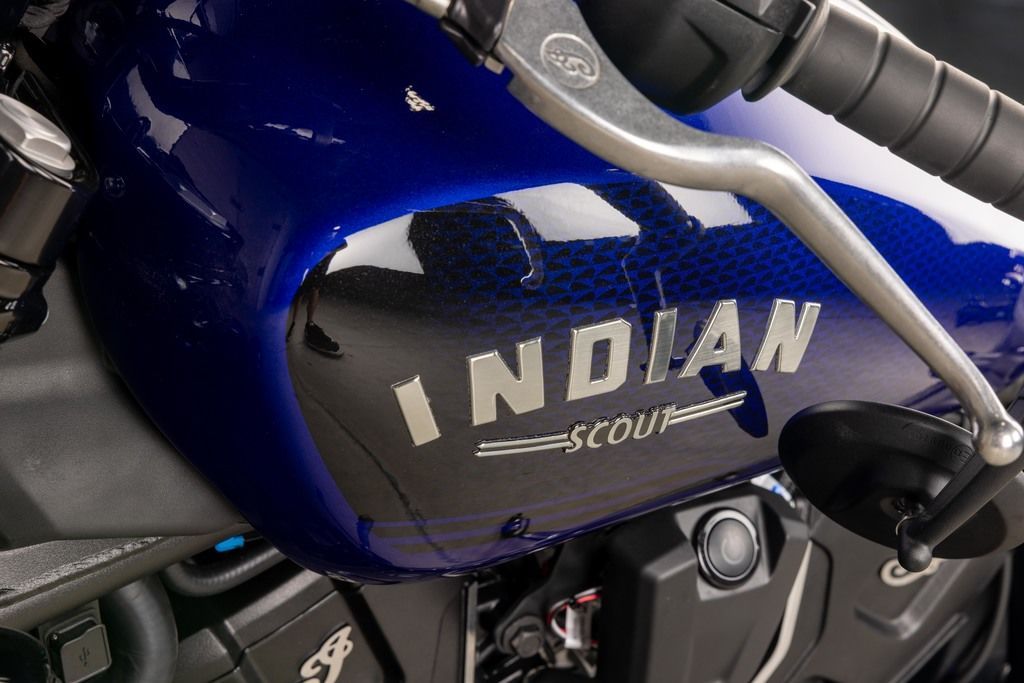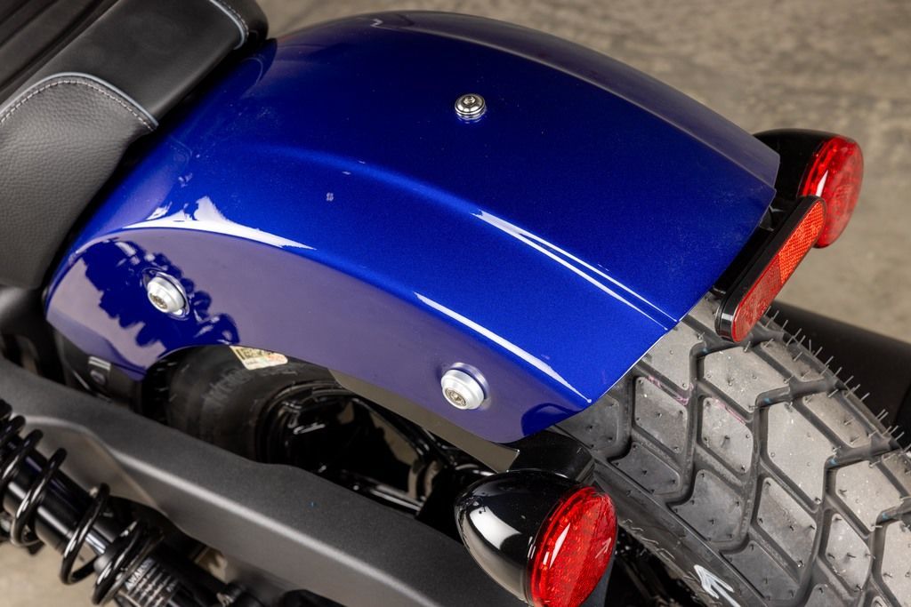 The contour lines on the rear fender seamlessly connect with the modern and dynamic Scout gas tank, creating a unified and premium blacked out aesthetic.