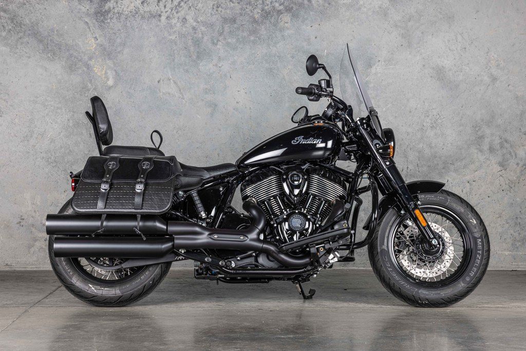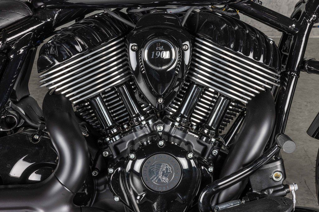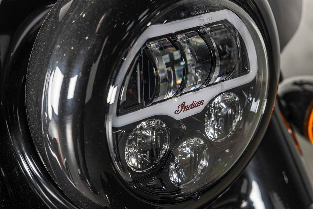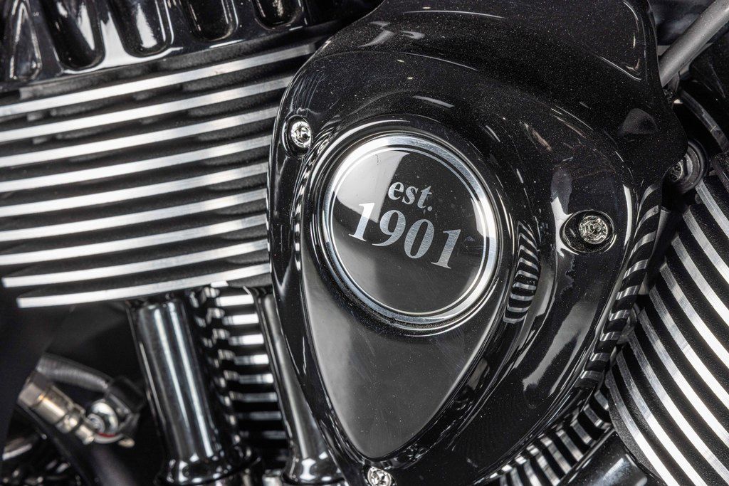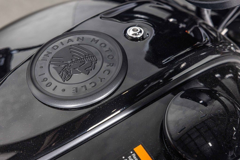Premium blacked out or chrome finishes, fork covers, wire wheels, and large headlight nacelle, and iconic Indian Motorcycle script badging on the tank, commanding attention at every corner.