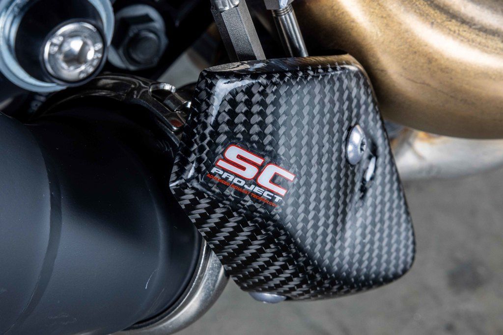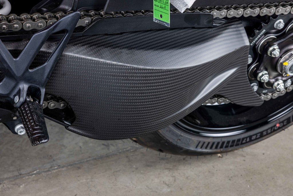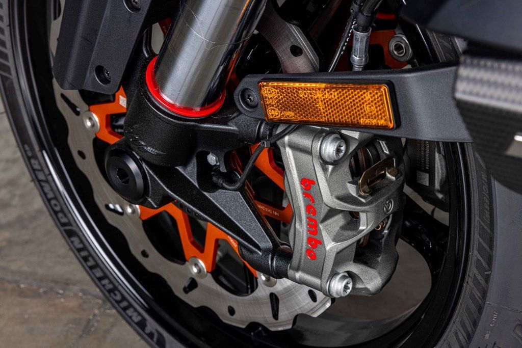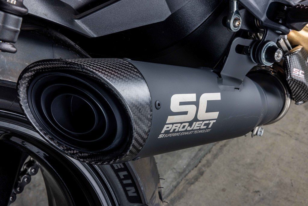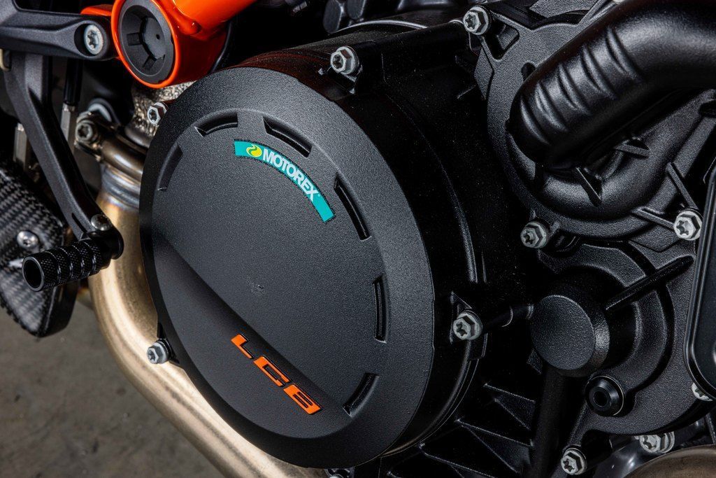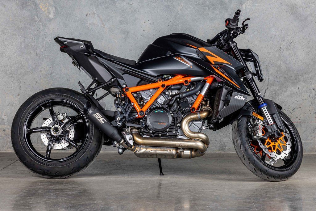 Superduke Evo R TechPak, SC Project S1 exhaust system, orange wave brake rotors, carbon winglet kit, carbon rear fender, carbon seat pilon cover, carbon fuel tank fairings, bar end mirrors, carbon swing arm, carbon ignition cover, NRG fender eliminator with integrated signals, topped off with a matching KTM Pit Mat for the garage!!! One of a kind machine taken to the limit!!!