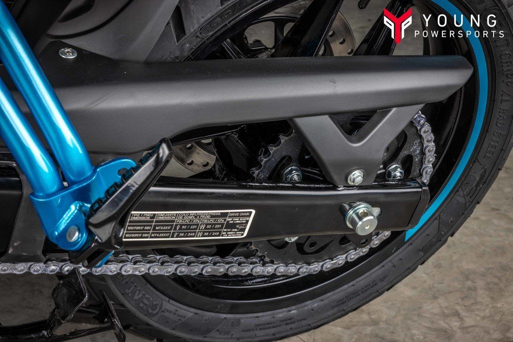 The Guerrilla 450’s 17” inch wheels, 120/70 front & 160/60 rear, wide-profile tubeless tyres with bespoke tread pattern keep you in control through all speeds and all situations.