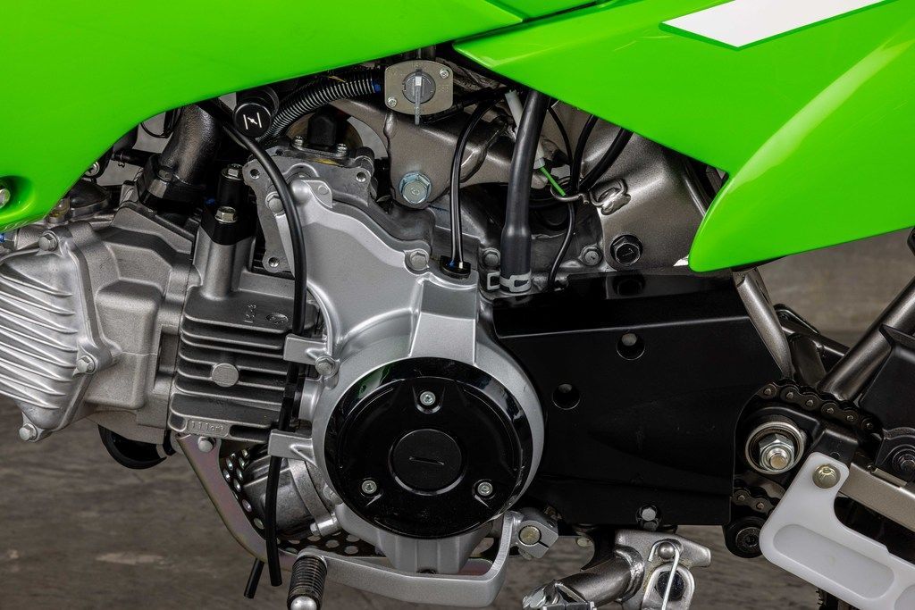 KLX®110R motorcycles are powered by a 112cc air-cooled 4-stroke engine. The KLX110R features a 4-speed transmission with automatic clutch while the KLX®110R L offers a manual clutch to learn big bike shifting techniques.