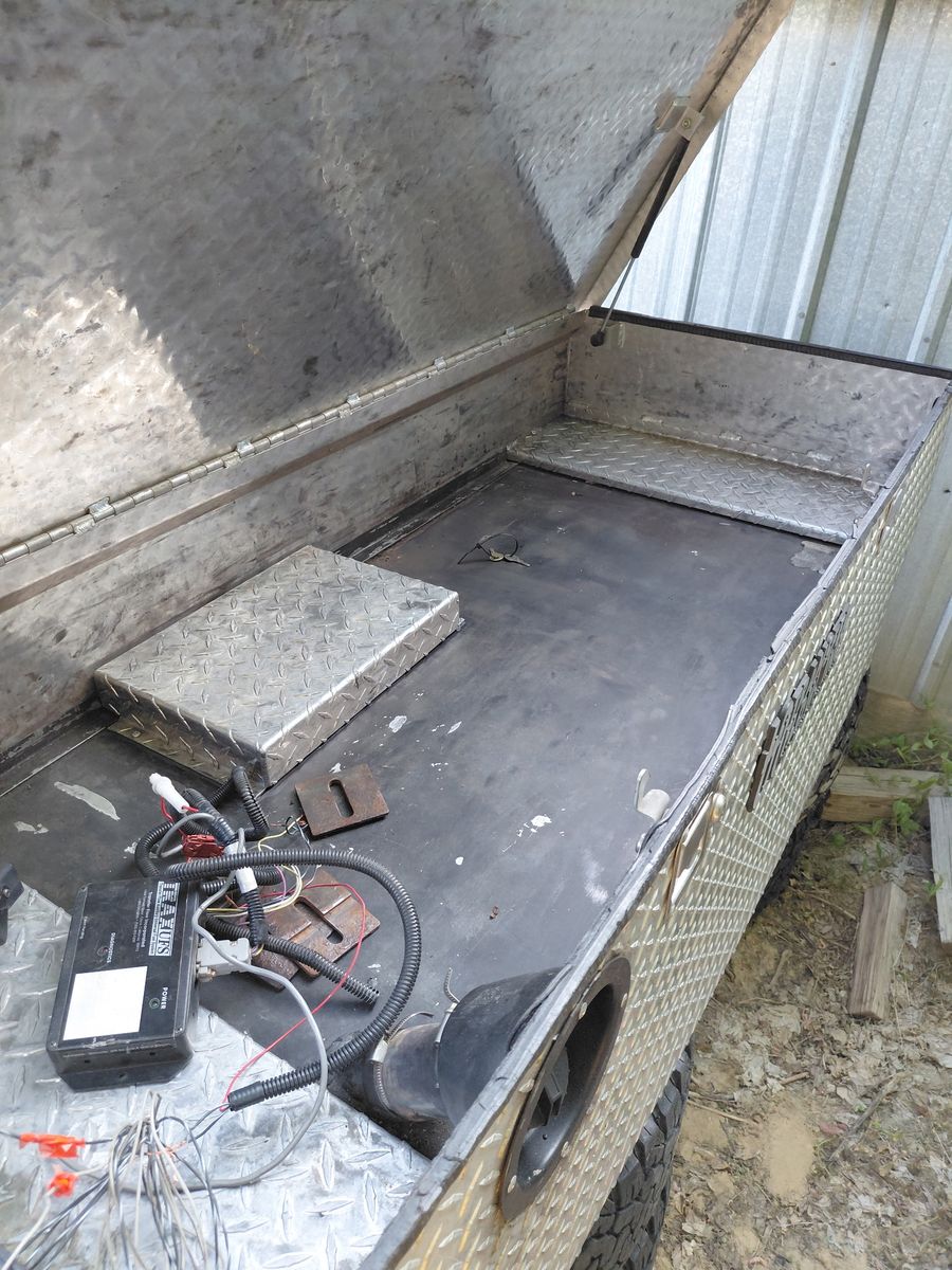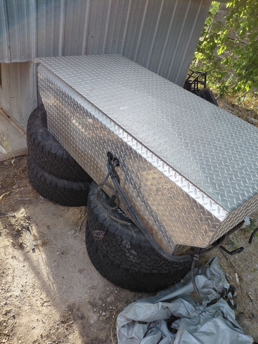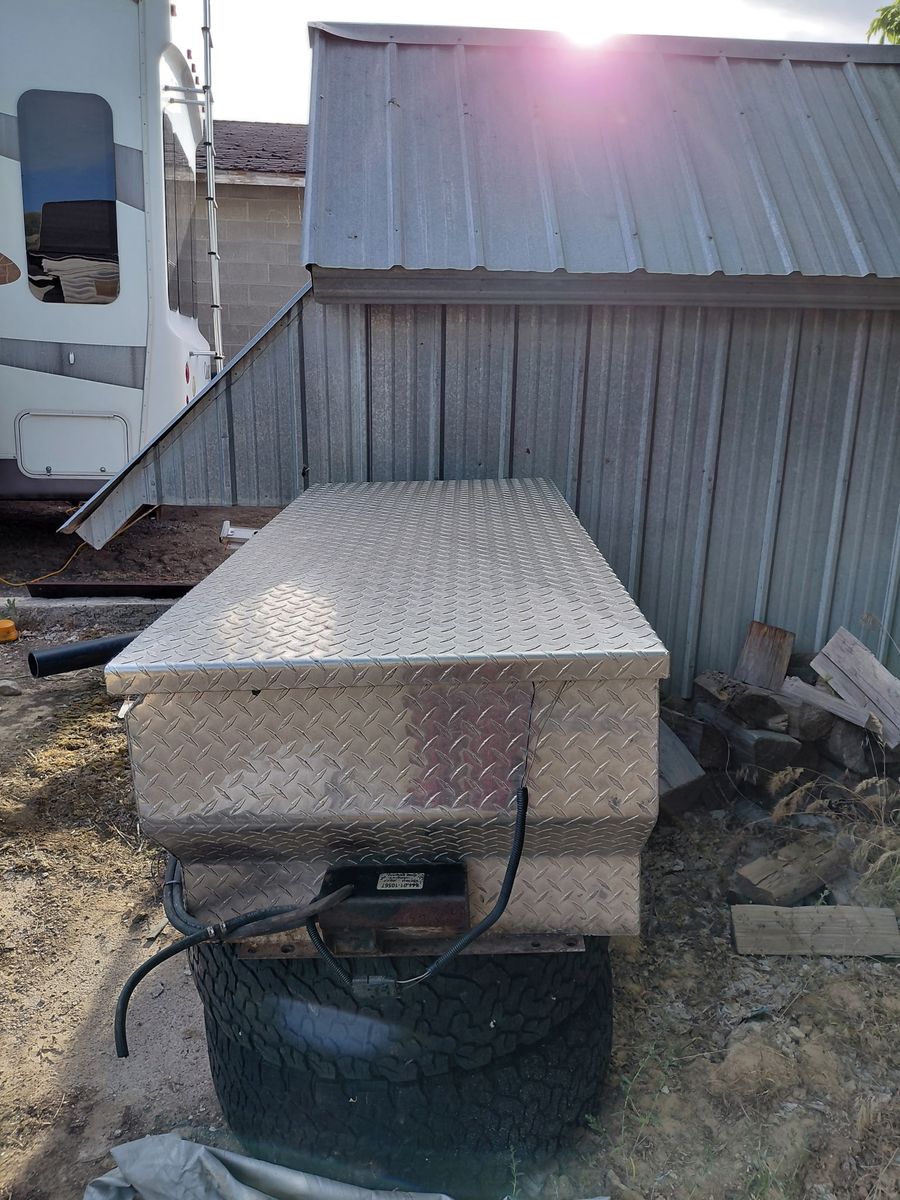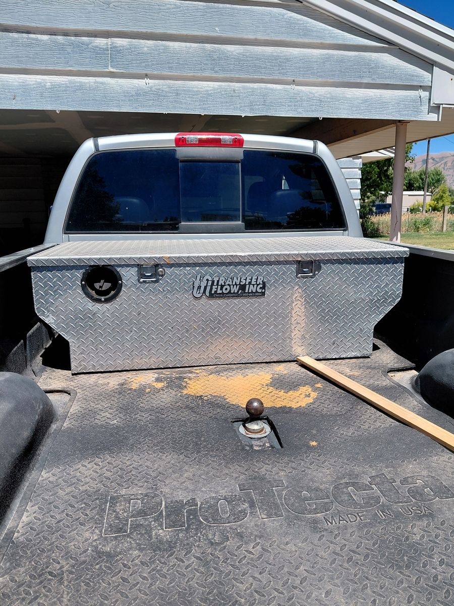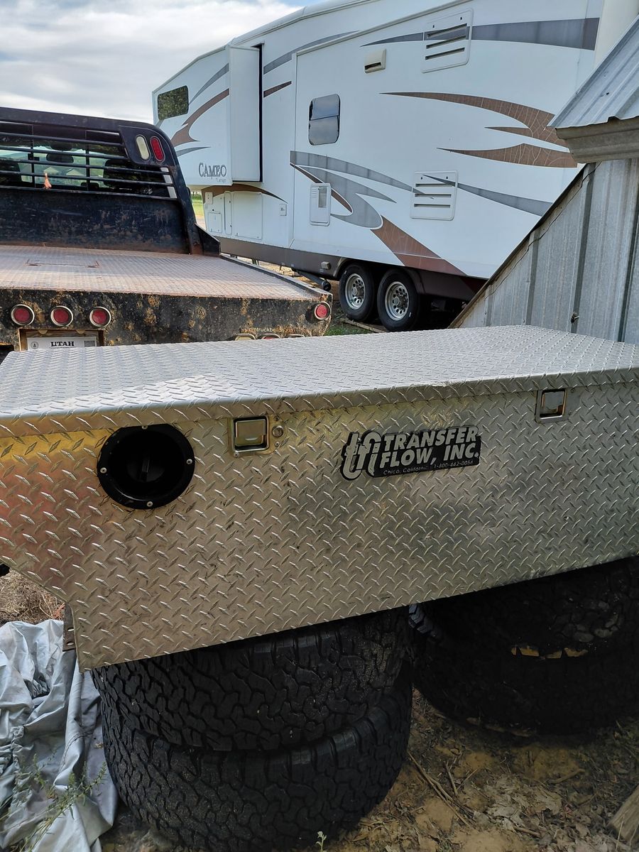 50 gal fuel tank tool box combo has everything to plum into fuel neck and transfer fuel to your main tank going down the road has a pump on the side of the tank have keys to the box text is the easiest way to get a hold of me