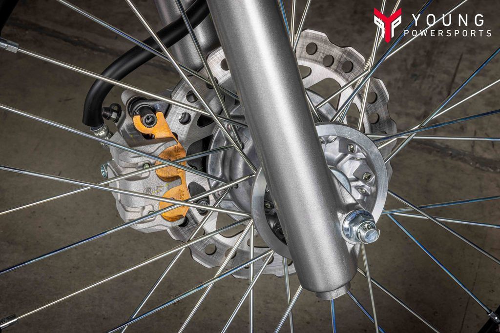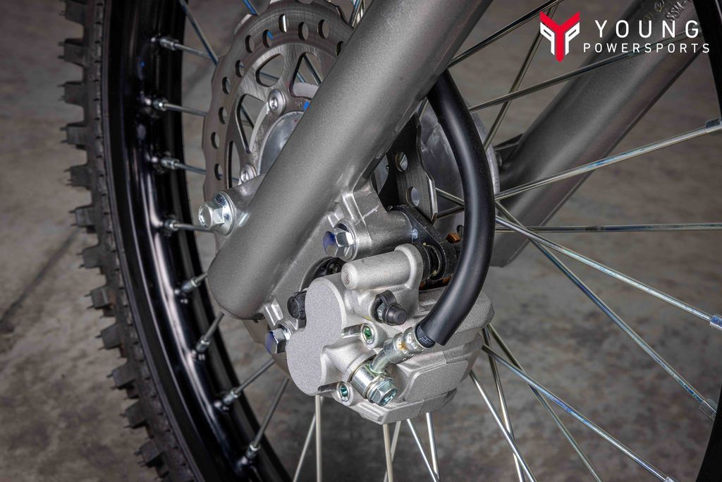 Front and rear disc brakes provide strong progressive stopping power. The 220mm front petal disc with a dual-piston caliper is complemented by a 186mm rear petal disc with single-piston caliper, inspiring confidence on the trails.
