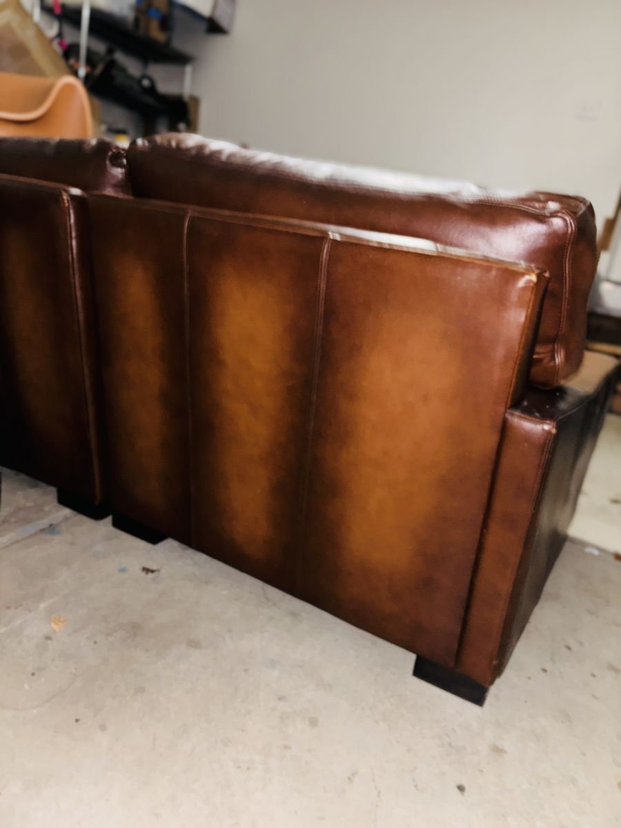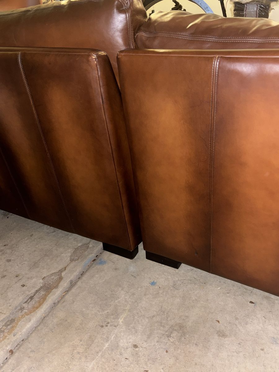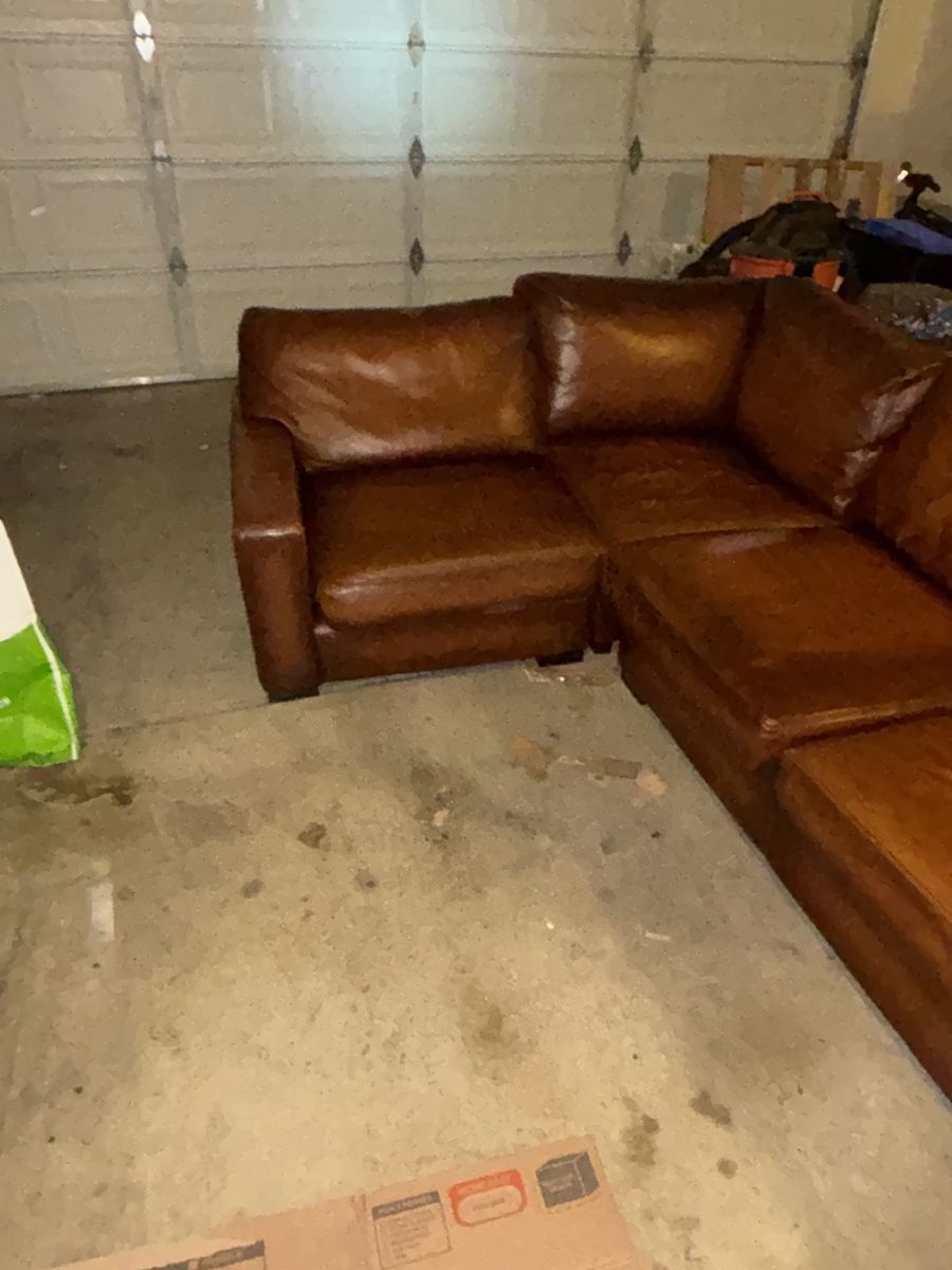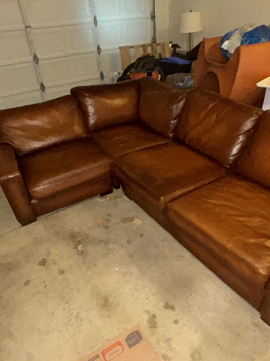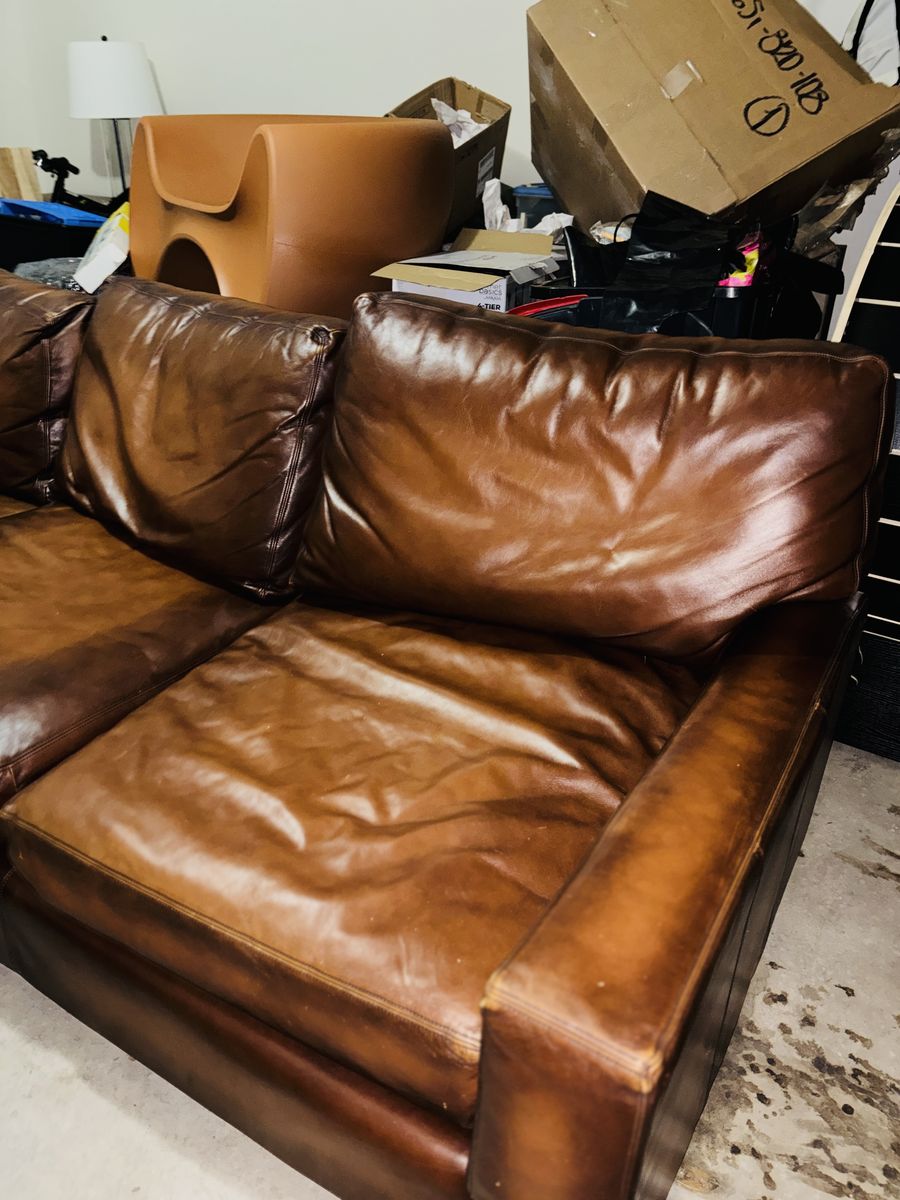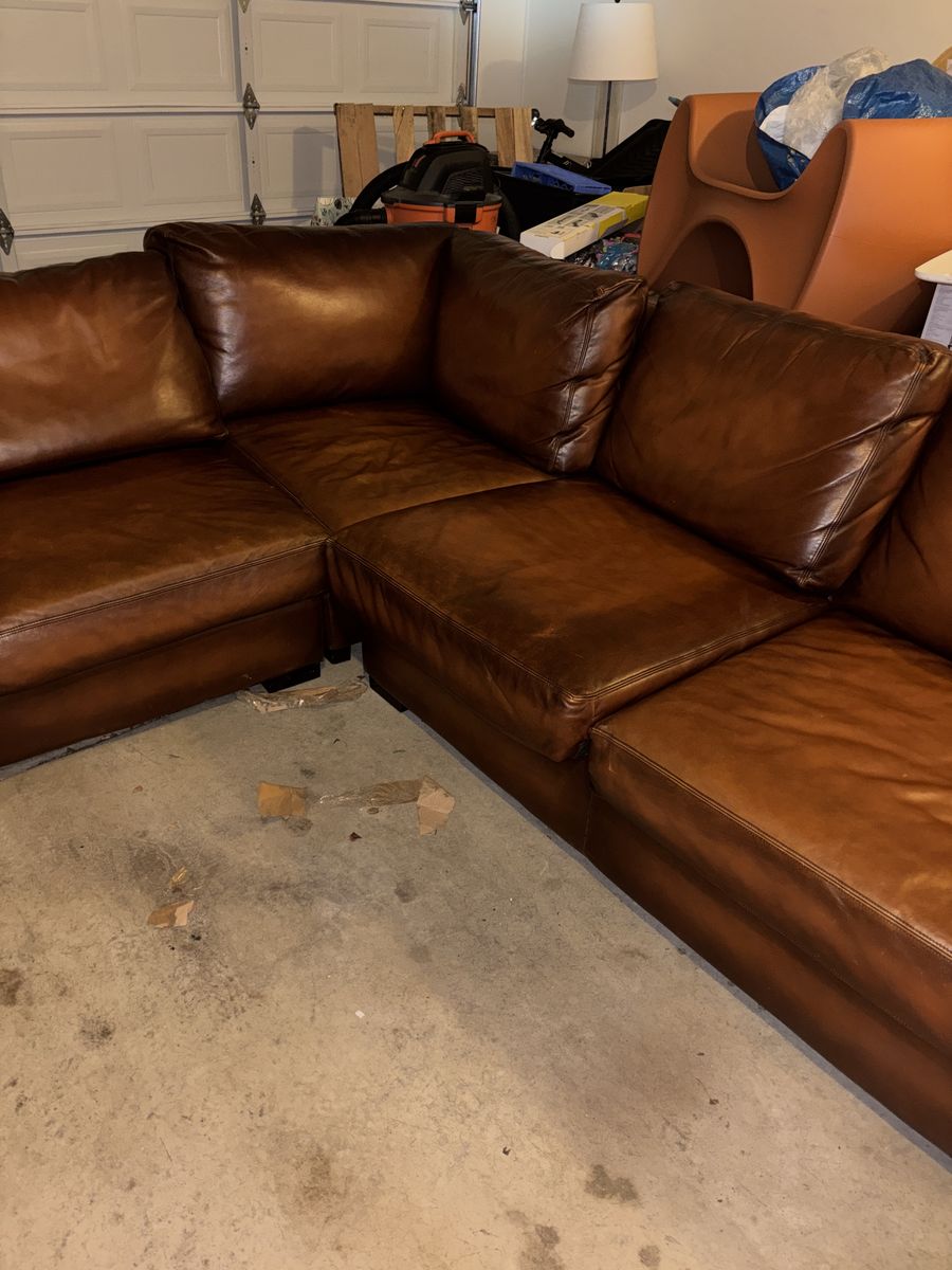 This genuine Pottery Barn L‑shaped leather sectional was gifted to me by a client specifically so I could sell it and put the money toward myself. It’s been extremely well‑kept, rarely used, and it shows.
