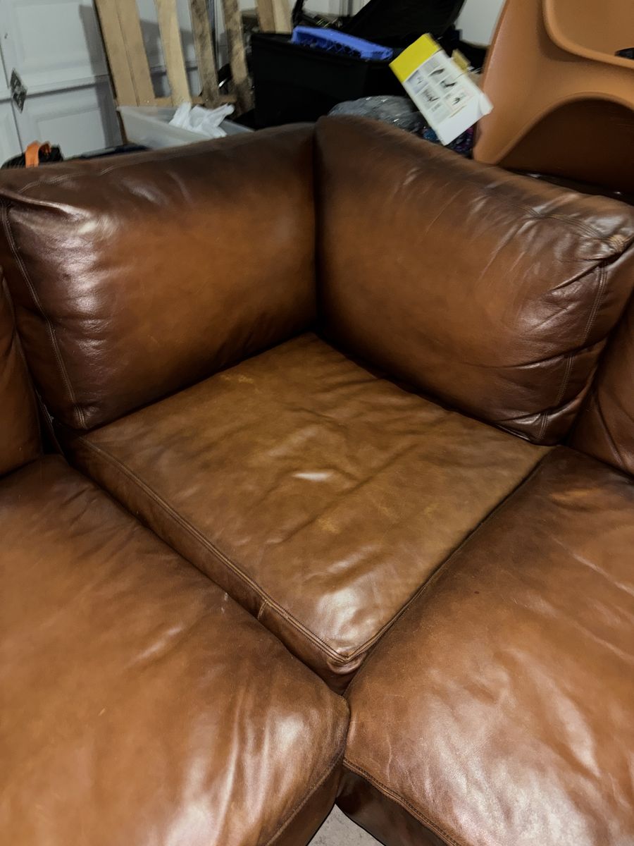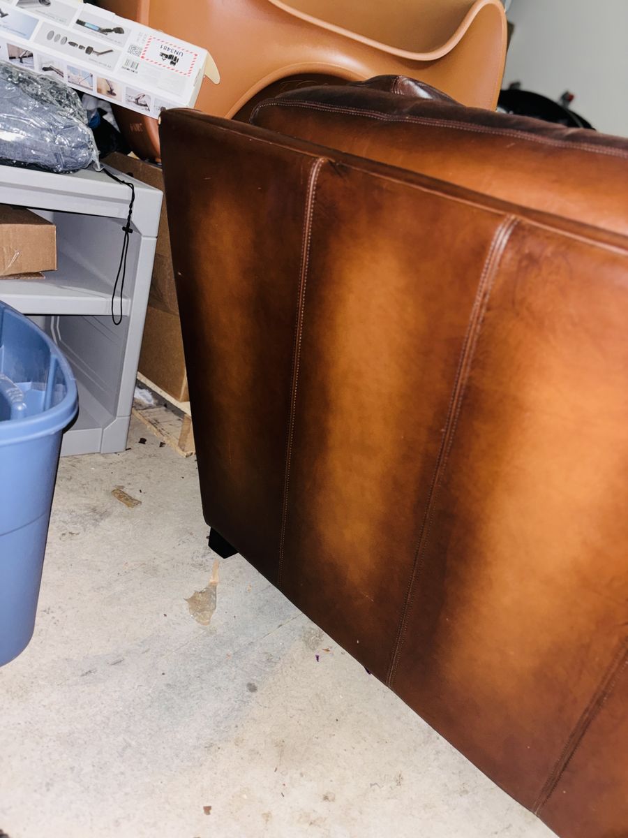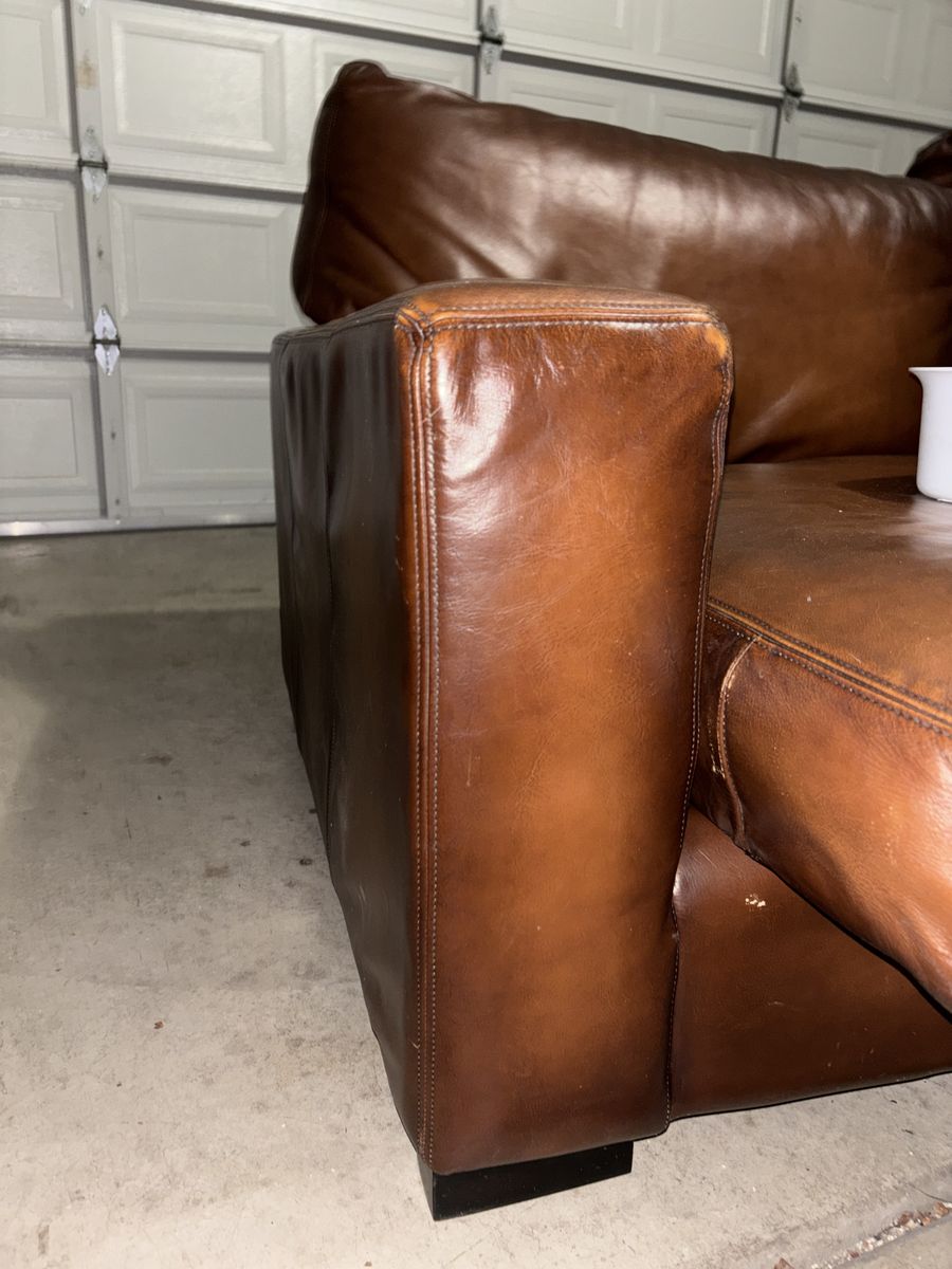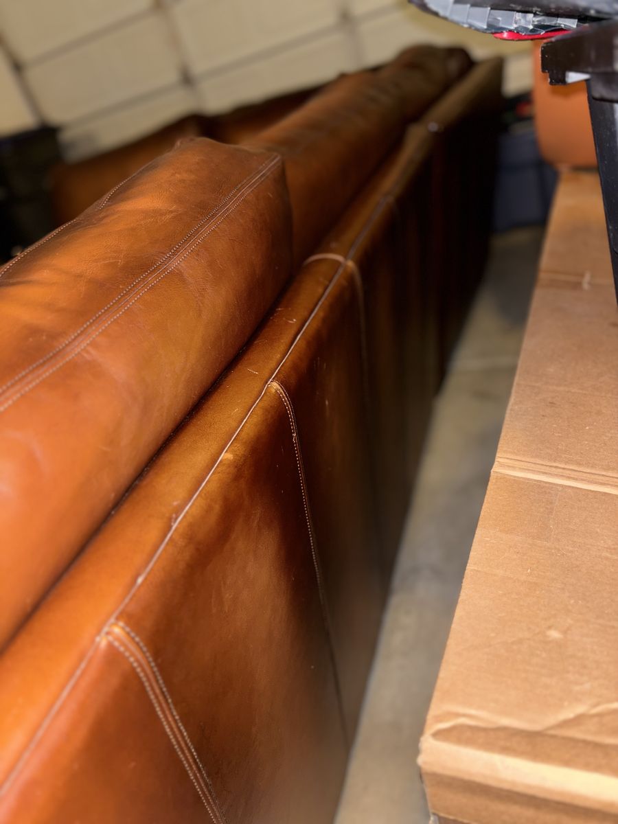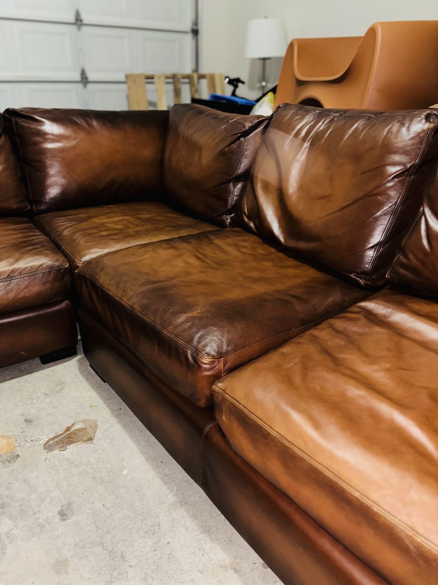 This genuine Pottery Barn L‑shaped leather sectional was gifted to me by a client specifically so I could sell it and put the money toward myself. It’s been extremely well‑kept, rarely used, and it shows.