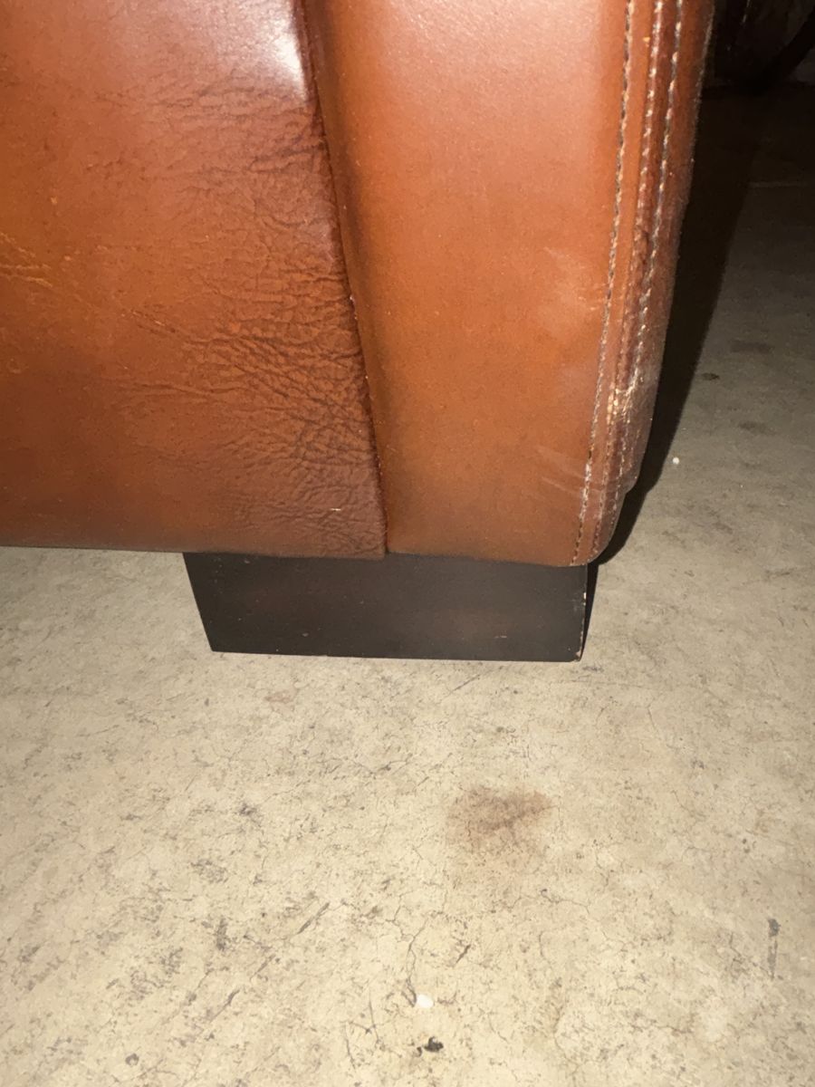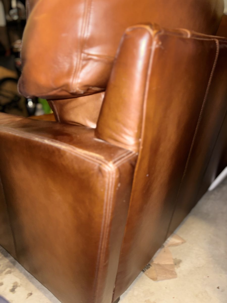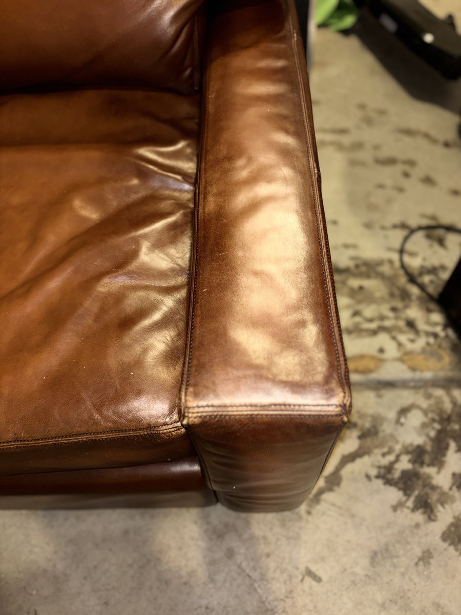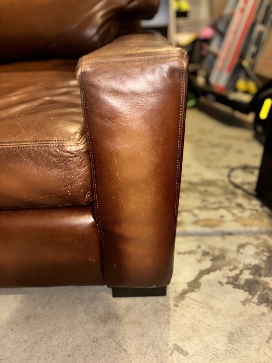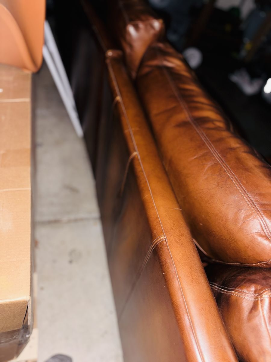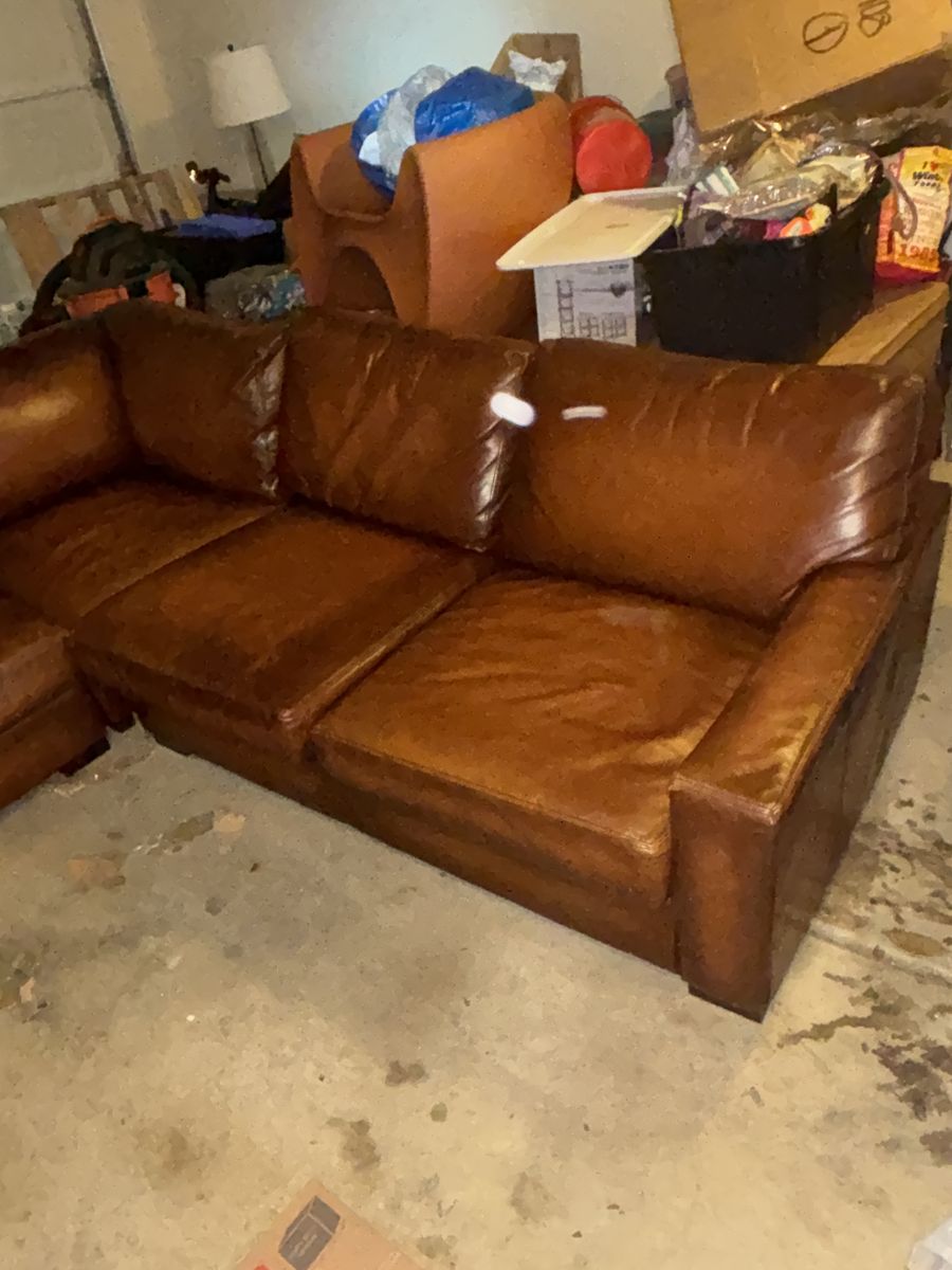 This genuine Pottery Barn L‑shaped leather sectional was gifted to me by a client specifically so I could sell it and put the money toward myself. It’s been extremely well‑kept, rarely used, and it shows.