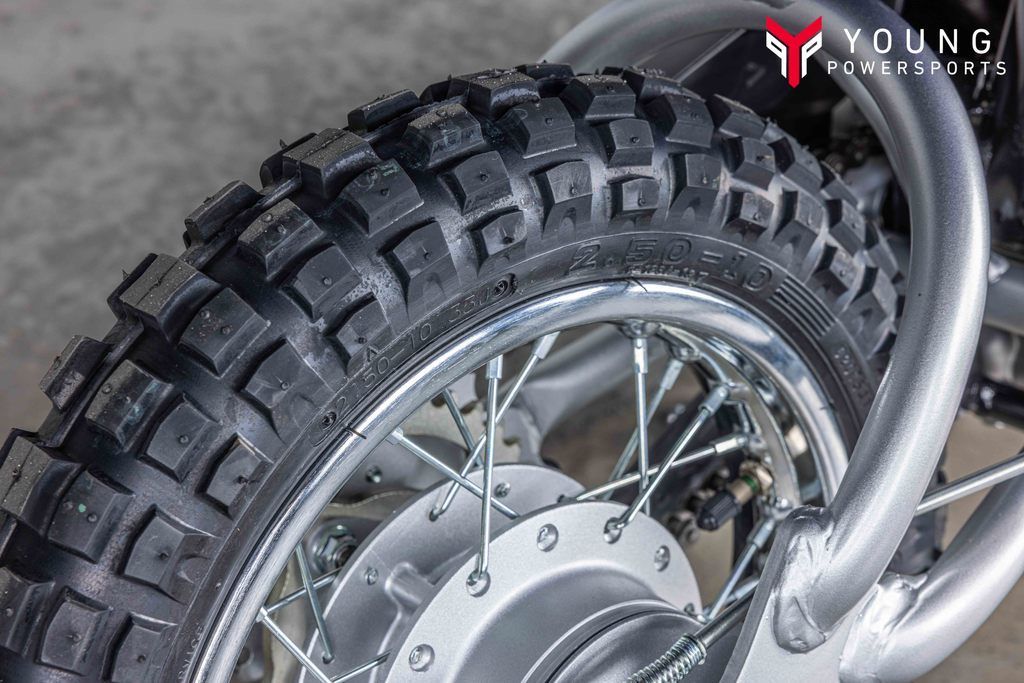 Durable knobby tires mounted on 10-inch front and rear wheels offer great grip and exceptional wear.
