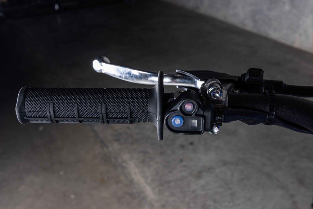 Tapered aluminum handlebars are secured to four-position adjustable handlebar mounts.