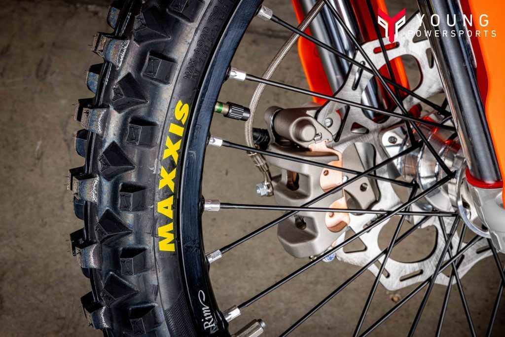Let's get the technical parts out of the way first; the 48 mm WP XACT AER forks fitted to the KTM SX and SX-F line-up features a capsulated air spring and pressurized oil chamber for progressive and consistent damping, while oil and air bypasses reduce pressure peaks. In combination with the mid-valve damping system, all this provides exceptional feedback and rider comfort. The fork also has settings which not only compliment the frame and rear linkage, but ensures stellar performance at all levels. Speaking of settings, these are easily adjusted via a single air pressure pre-load valve, as well as easy-access click adjusters for compression and rebound. Additionally, the WP air pump needed to adjust the fork's air pressure is provided as standard in the buy-pack.