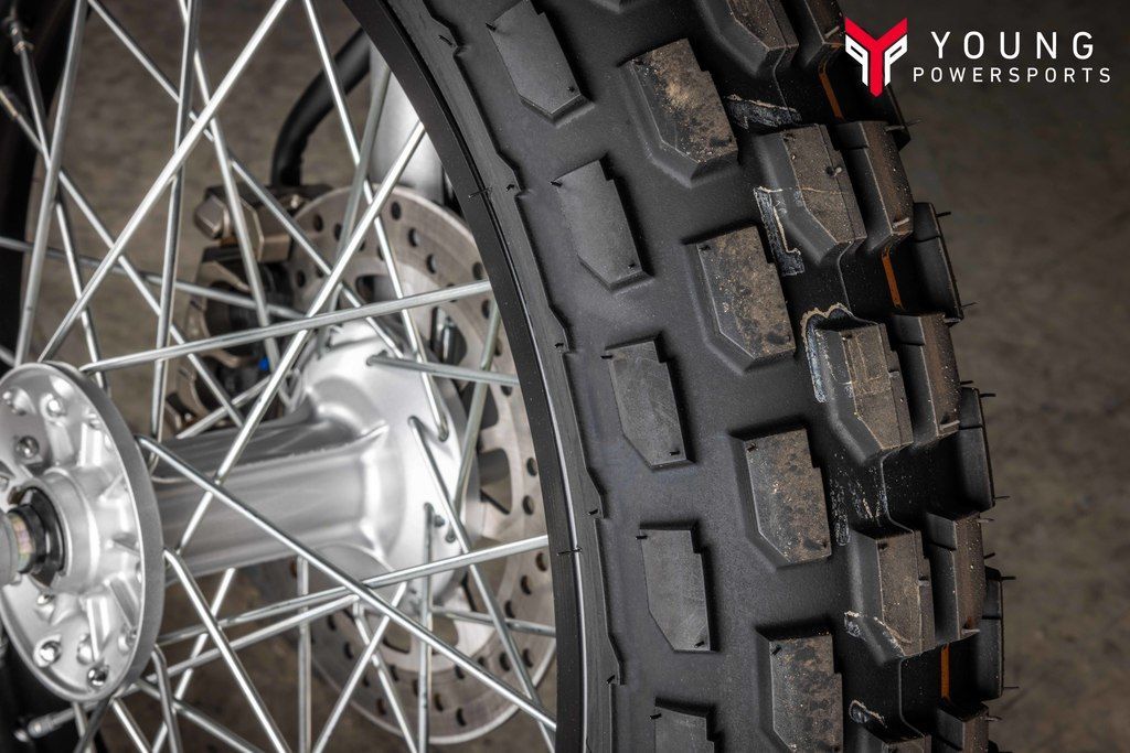 Fat 130/80-18 front and 180/80-14 rear tires provide excellent traction, and control to make conquering all types of challenging terrain easy and fun.