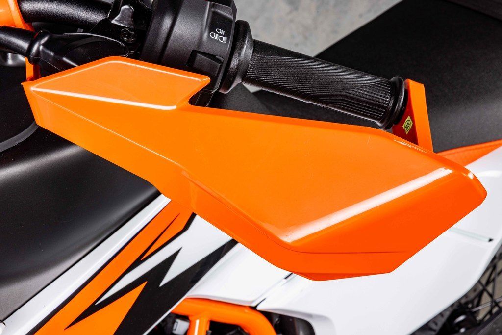 The KTM 390 ADVENTURE range features distinctive KTM-style bodywork and graphics, providing excellent ergonomics and an aggressive look inspired by KTM's vast Rally racing heritage. This can be seen in everything from the headlight mask to the front fender. The tank spoilers and rear side panels are slightly wider than the seat for optimized control when standing on the pegs, while the shape of the fuel tank is optimized to offer freedom of movement when tackling tricky technical terrain. A robust engine guard also makes its intentions known by protecting the engine and exhaust when venturing off the tarmac into the dirt.