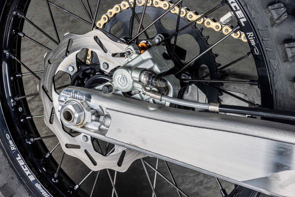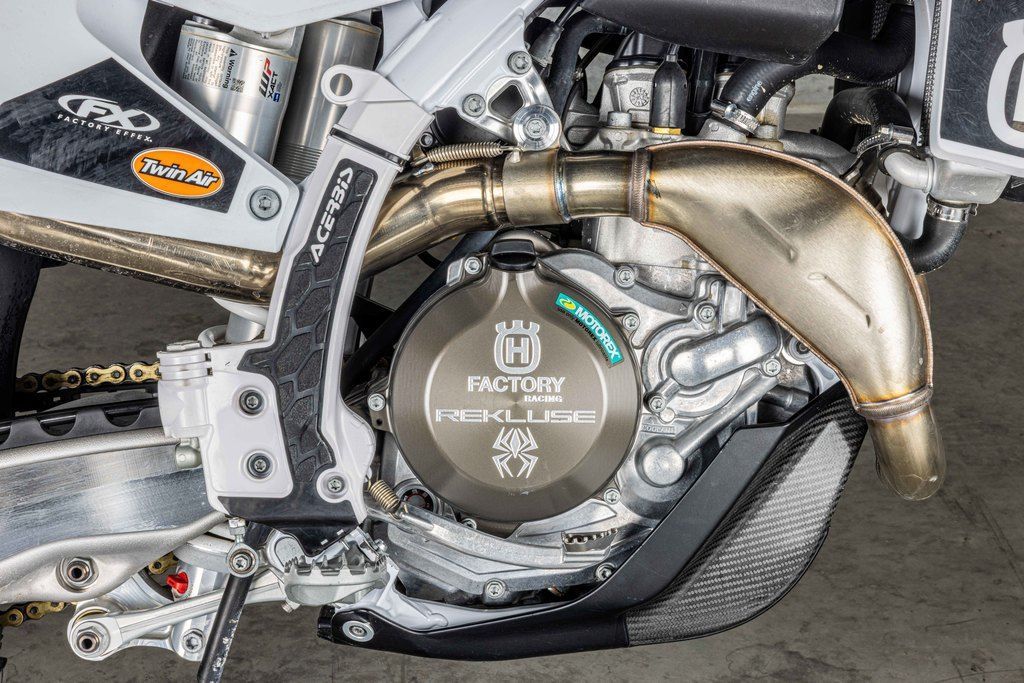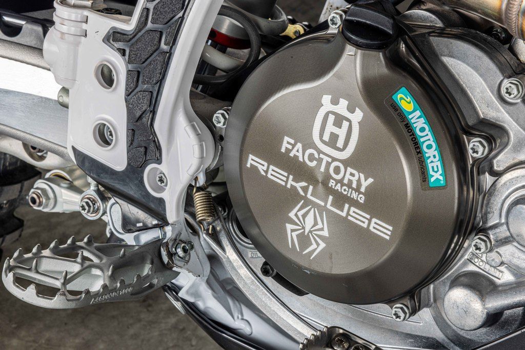 The FC 450 features a Dampened Diaphragm Steel clutch, which includes a single-diaphragm steel pressure plate instead of traditional coil springs. It integrates a damping system for better traction and durability. The clutch basket is a single-piece CNC-machined steel component, which has been revised to accommodate the new gearbox in 2023, and continues to allow the use of thin steel liners that contribute to the compact design of the engine.