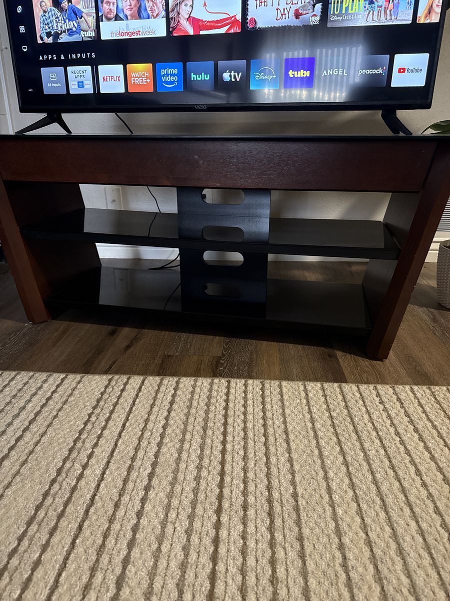 Cherry wood tv stand with 3 removable glass shelves. 48"x17".5x21". With hidden drawer. Fits tvs up to 50". Asking $40. Must go before 3/20. pick up only