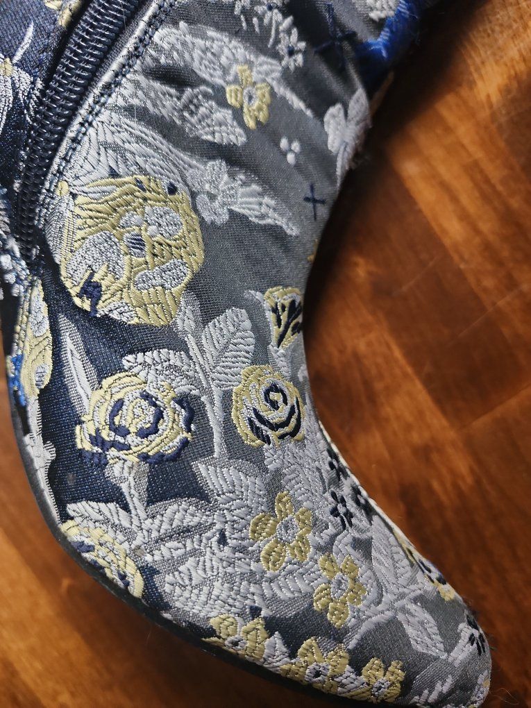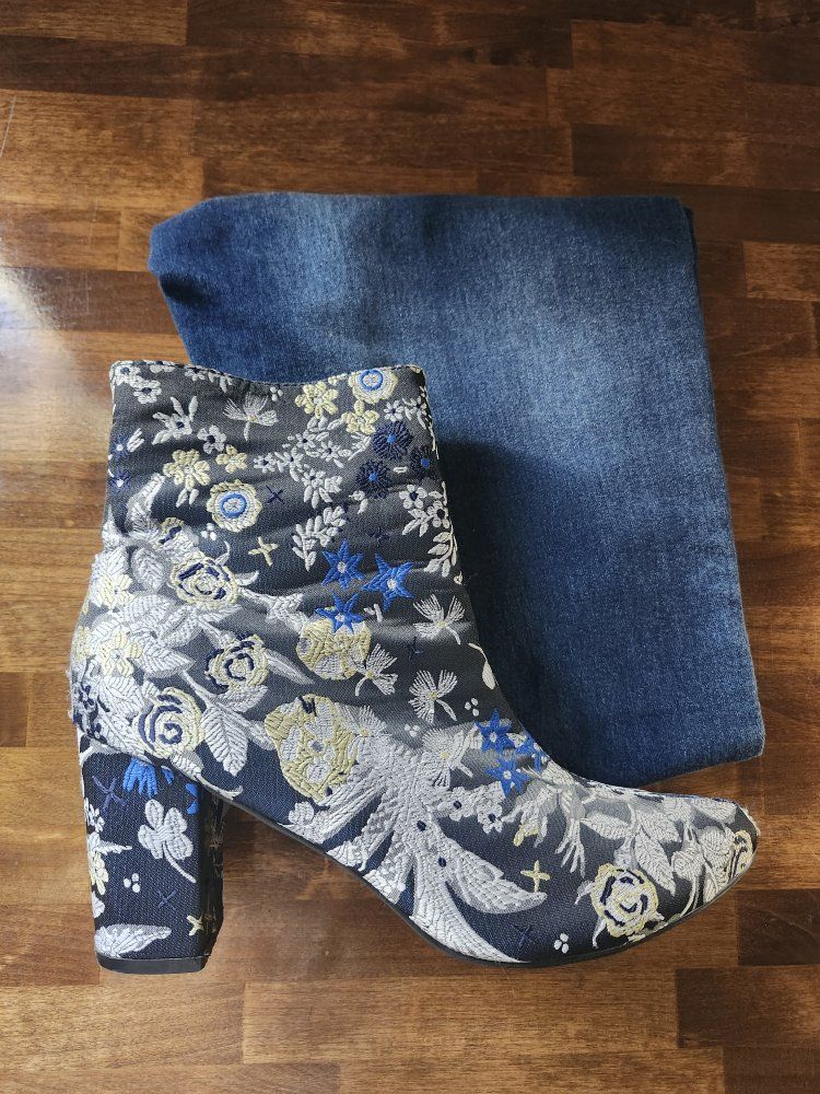 VenmoChunky heel and inside ankle zipper. Both zippers work perfectly. S Soft brown lining inside and very comfortable. These are unique statement boots with black fabric and gold, silver and blue floral embroidery. Great for fall outfits, dresses or jeans. They're in great condition and ready to wear. Just clearing out space and simplifying, so priced to sell.