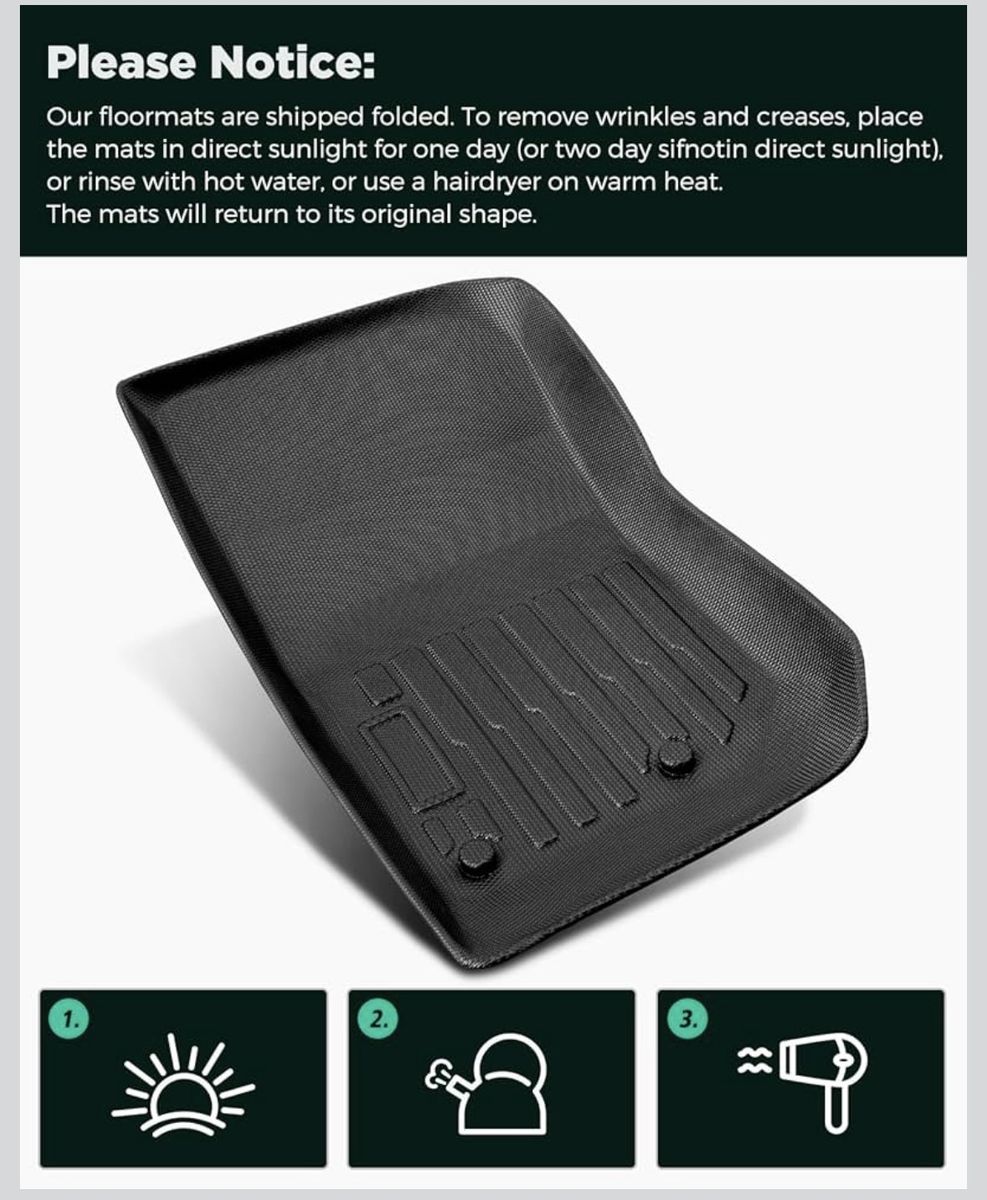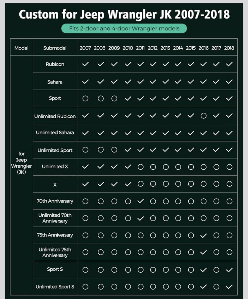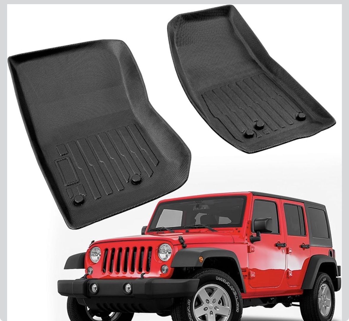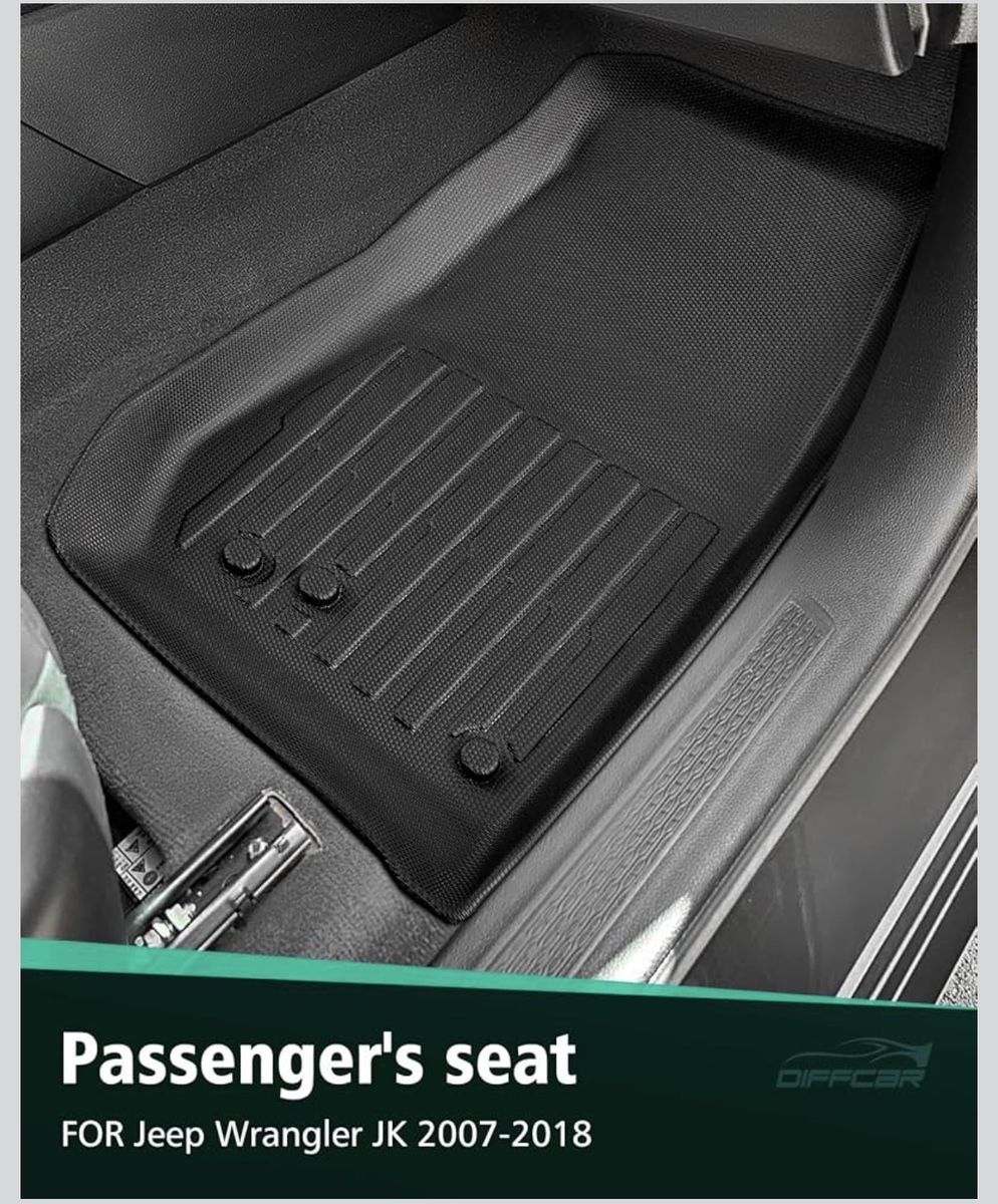 FIT PRECISE: Custom-fit design to satisfy front floorliners for Jeep Wrangler JK 2-door and JK Unlimited 4-door 2007 2008 2009 2010 2011 2012 2013 2014 2015 2016 2017 2018, cover entirely from edges to edges with 2-peice floor mats for Jeep Wrangler JK/JKU 1st row (Driver & Passenger). DUR-ABLE QUALITY: Made with first-rate rubber TPE material which is comfortable and thick, the surface and bottom of car floor mats are nonslip, which can provides a firm grip and will not slide during driving. Our floor mats for Wrangler 2018 2017 2016 2015 2014 2013 2012 2011 2010 2009 2008 2007 accessories are great for off roading. EASY TO CLEAN & MAINTAIN: Designed with a textured surface, car floor liners for Jeep Wrangler JK 2-door & JK Unlimited 4-door 2007-2018 can trap dirt and liquids, while the non-stick material makes cleaning quick and convenient. Meanwhile, our car floor liners can be installed and removed without any tools. ALL-WEATHER MATS: All-weather car floor mats for Jeep Wrangler 2007-2018 are water-repellent and stain-resistant and can protect your floor carpet, whether it is rain, snow, mud, or spills, they can keep your vehicles clean and dry year-round with rubber car floor mat, resisting warps or shifts even in extreme weather or under heavy cargo. LONG-TERM PROTECTION: The deep grooves and water-repellent edges of the foot pads prevent dirt, sand, snow and water from entering the car, keeping the car clean and tidy, and providing long-term protection for Jeep Wrangler JK and JKU 2007 2008 2009 2010 2011 2012 2013 2014 2015 2016 2017 2018 interior.
