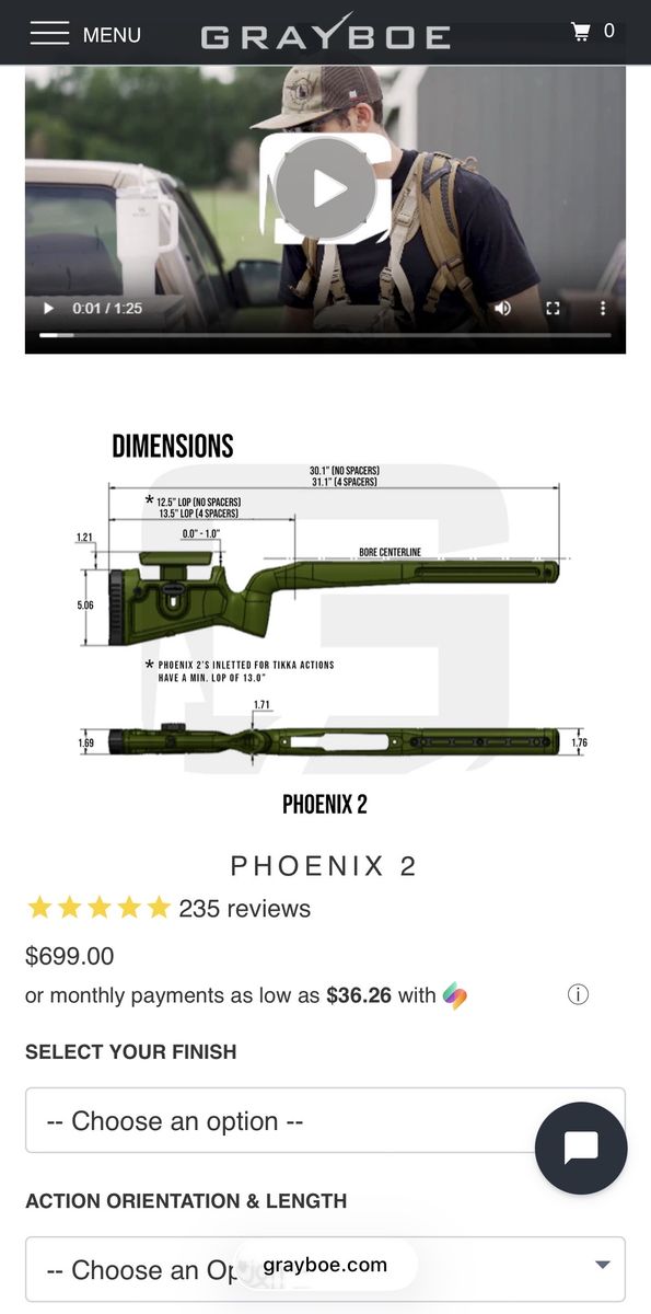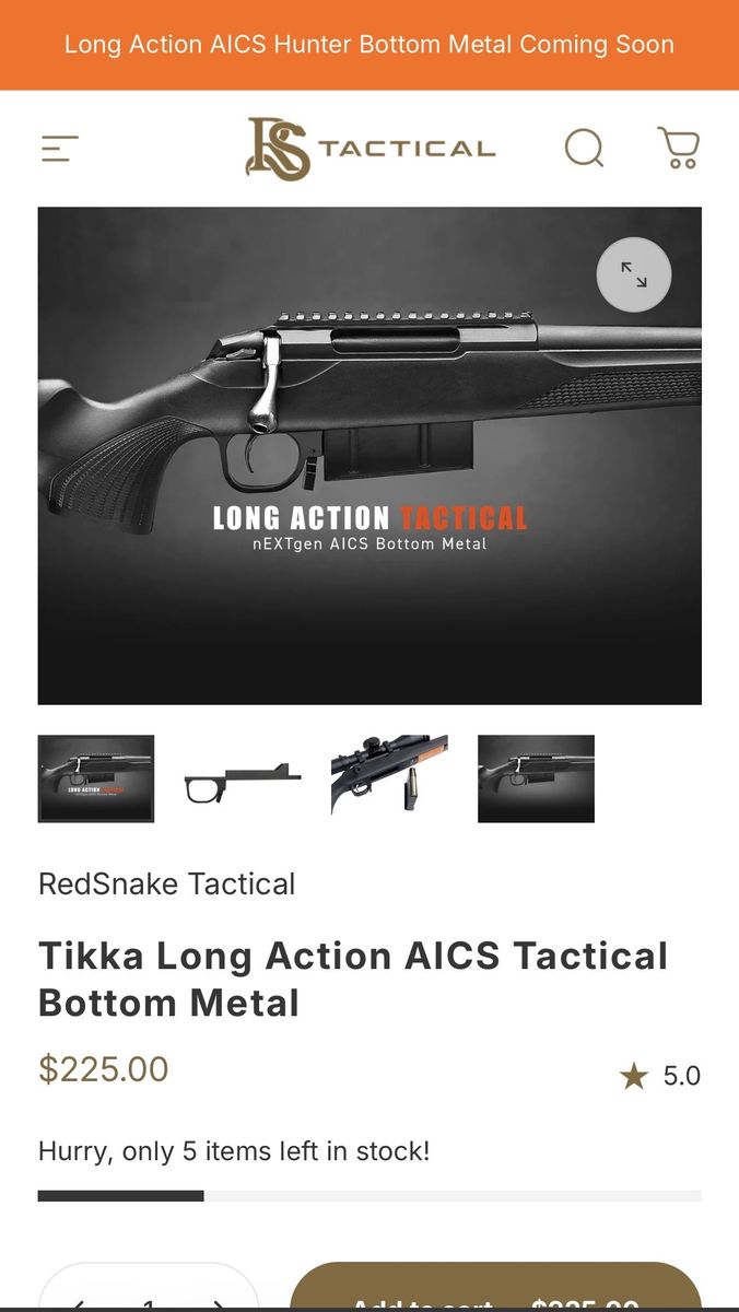 VenmoGrayboe stock for a tikka action. I put on the red snake tactical LONG ACTION bottom metal. Very smooth and Perfect for any of your bigger cartridges. Especially if you reload. Can still use the factory bottom metal if you want. This is a great stock, I just ended up going with a chassis instead. Looking to get $600. Make me an offer. Would consider trades for a nice scope.