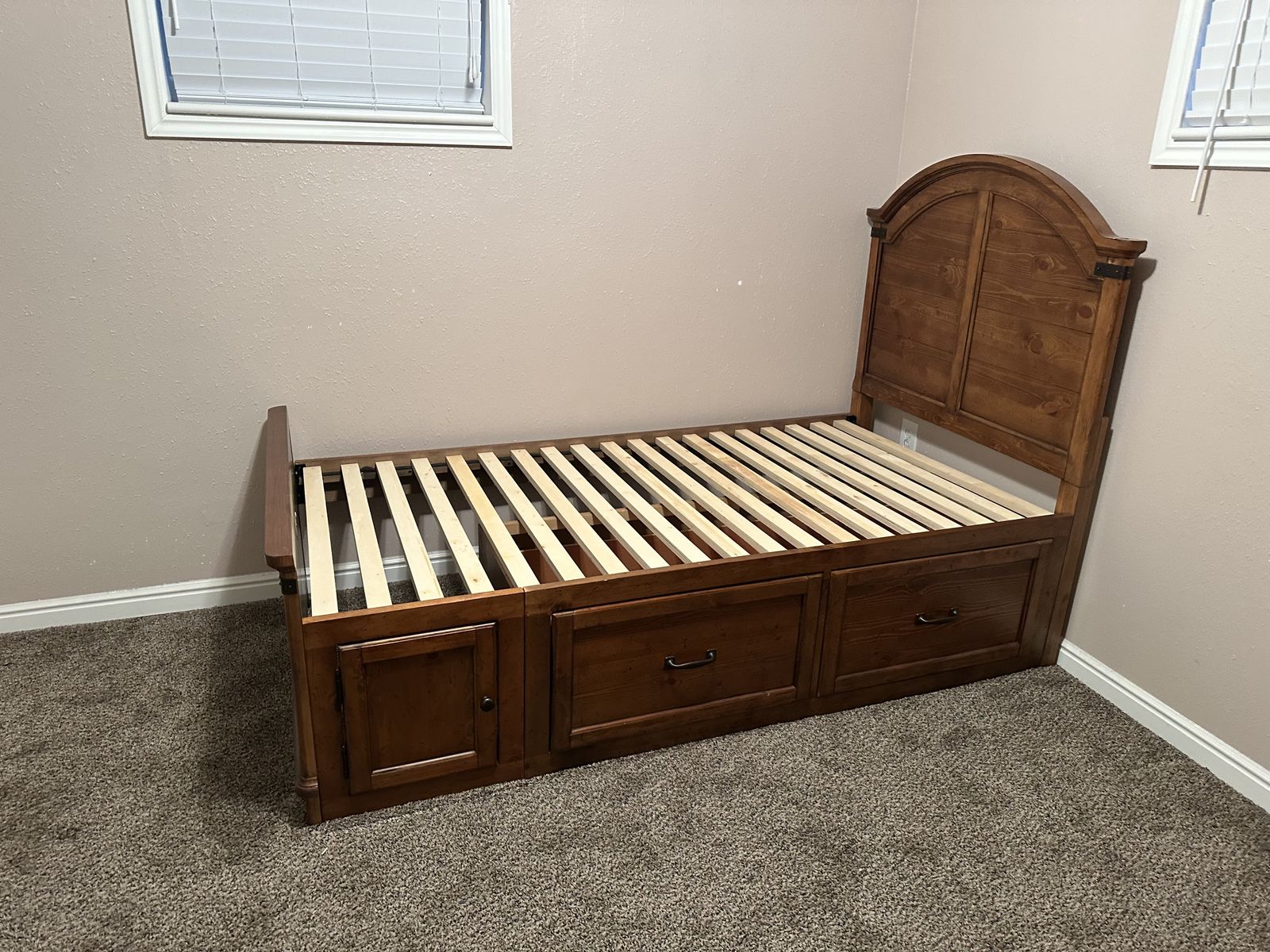 VenmoBeautiful wooden twin bed w/drawers (very lightly used). Bed placed in a guest room that was very rarely utilized. Wooden headboard, footboard, and slats. Mattress like new as it was rarely used and always had mattress cover on.